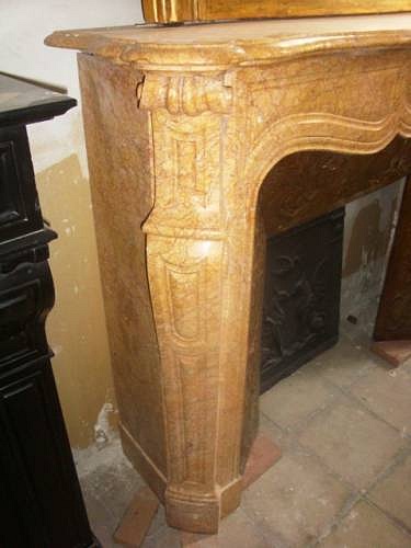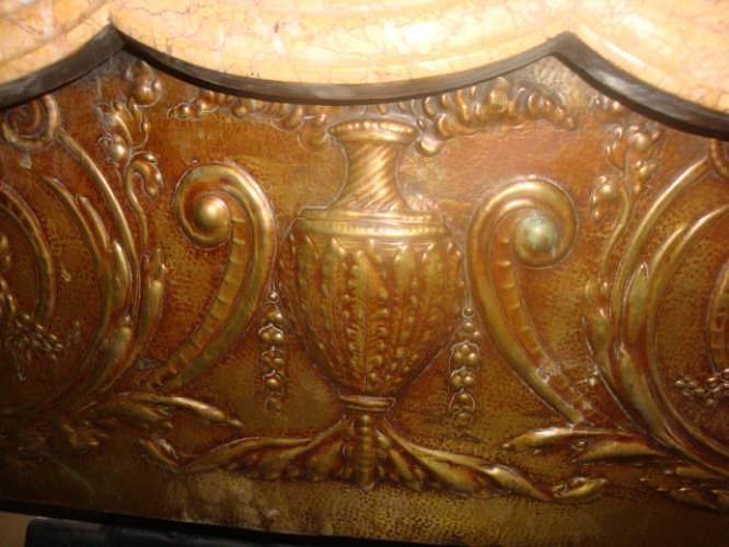 CAMINETTO POMPADOUR GALBE' IN PREZIOSO MARMO GIALLO FIORITO, BUONA CONSERVAZIONE GENERALE, PROVENIENZA PARIGI, EPOCA 1860 C.A, DOTATO DEL SUO ORIGINALE E FINISSIMO CONTROCUORE IN OTTONE SBALZATO A MANO..
