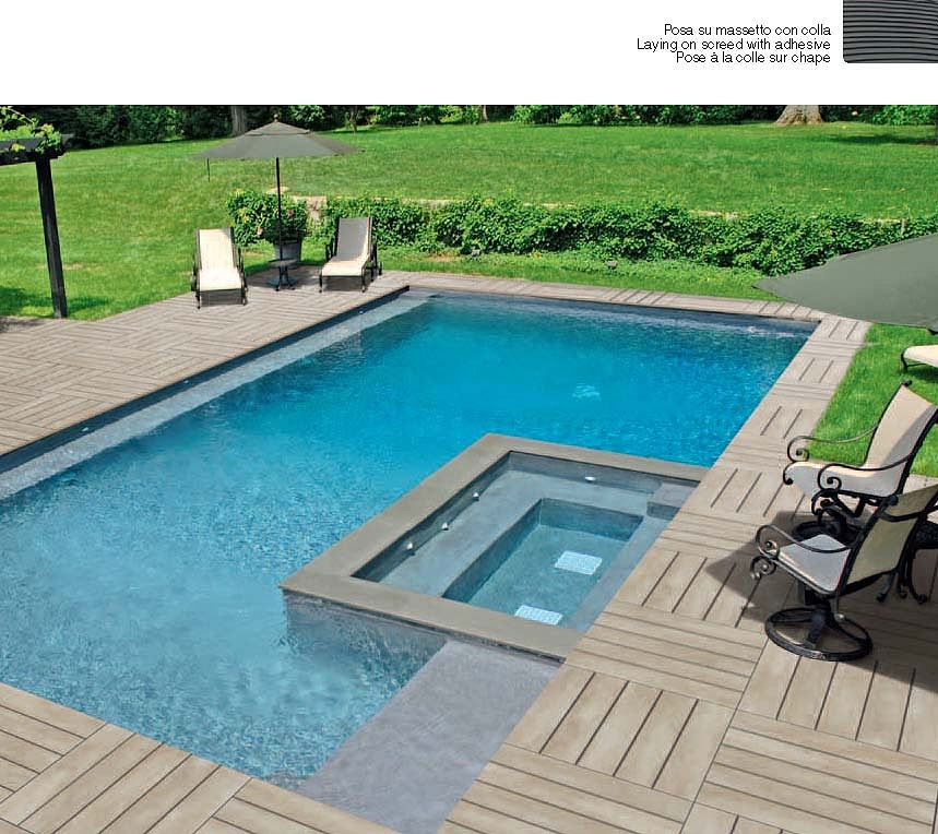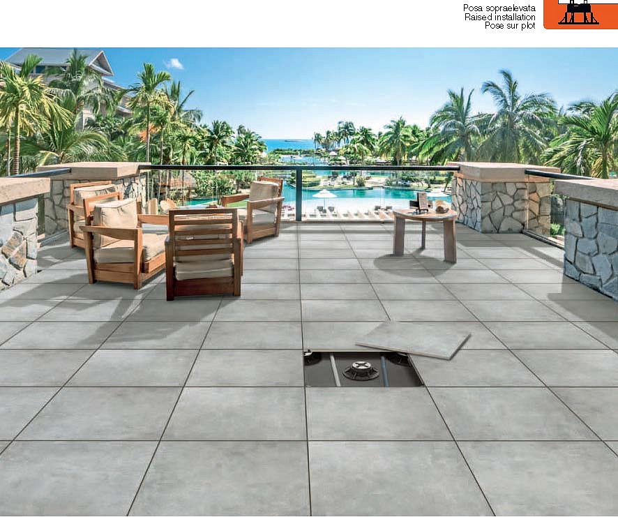 Pavimento per esterno con posa sopraelevata a secco. Materia pregiata e spessorata
