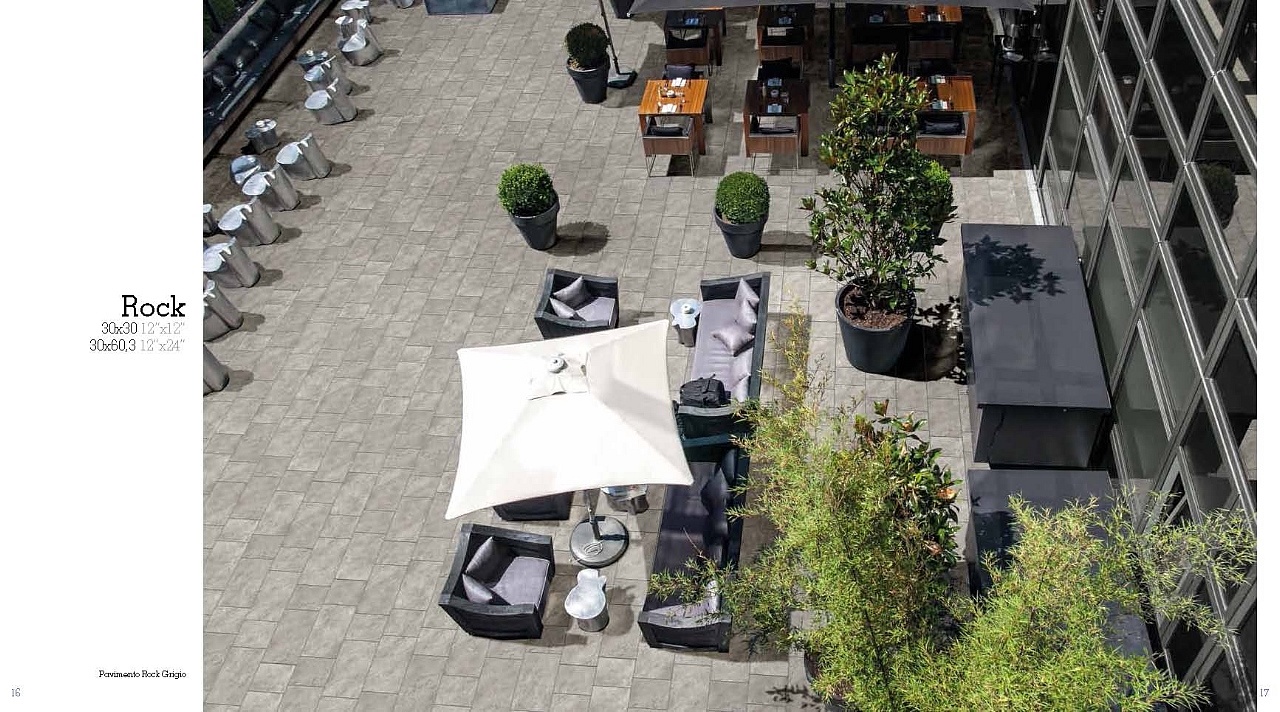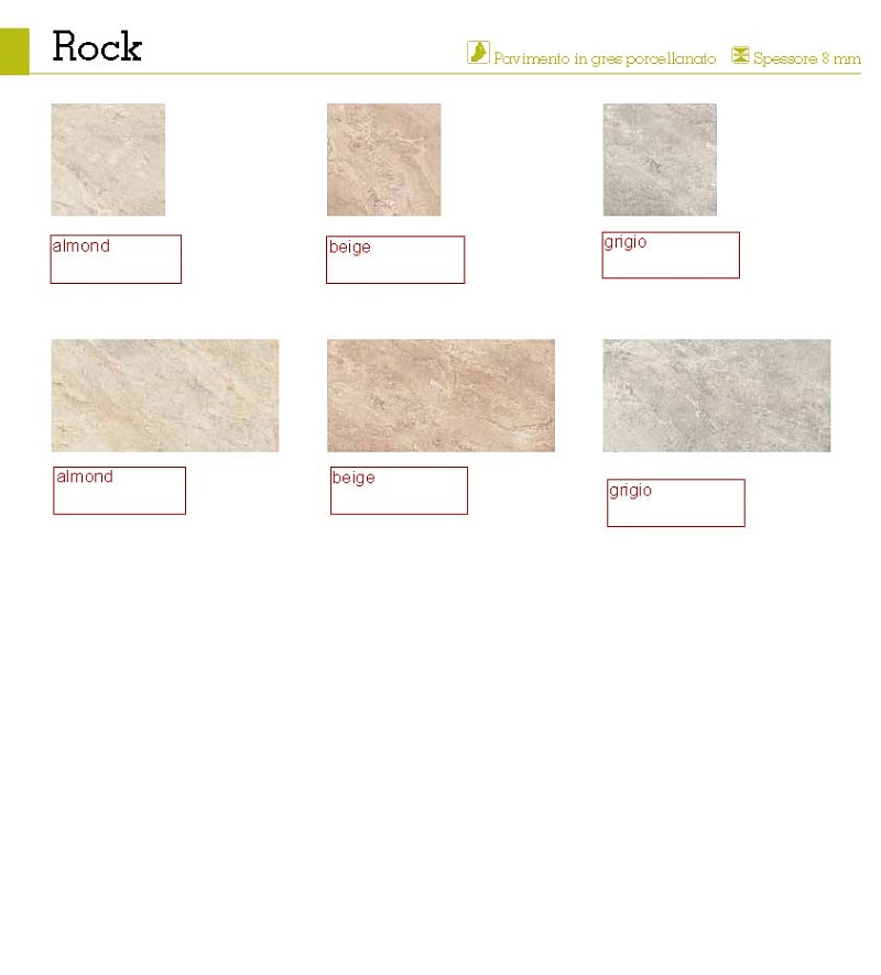 Prodotto con tecnologia digitale, la serie Rock ben si adatta a tutti gli ambienti rustici ove sia richiesto un prodotto funzionale, adeguato all'ambiente circostante e sopratutto facile da pulire. I formati sono di facile posa, anche con posa mista nel formato 30x30 e 30x60 oppure con una posa a disegno tipo a rombo per il 30x30 e una posa esterna per il 30x60 a correre.