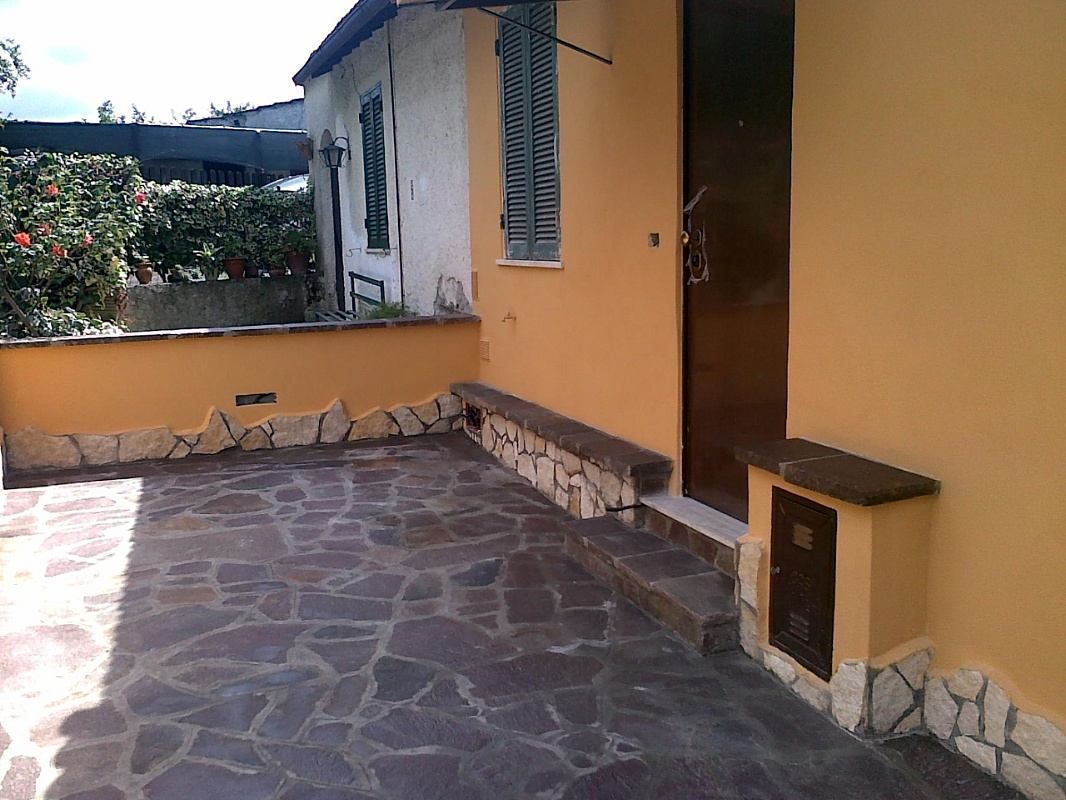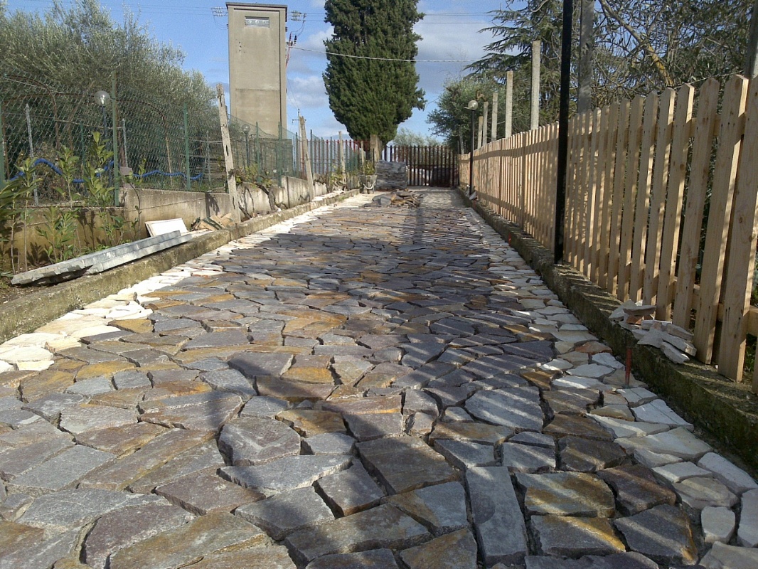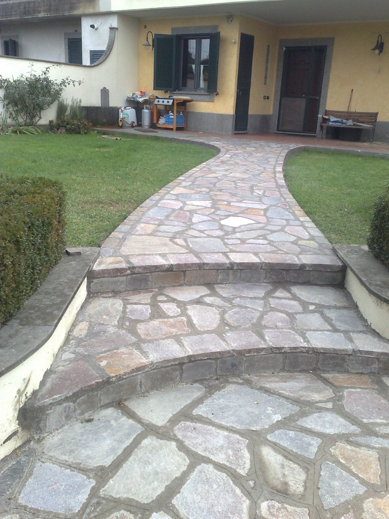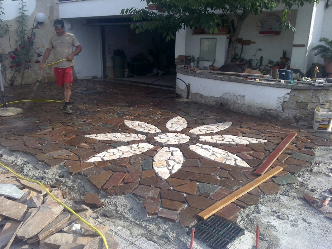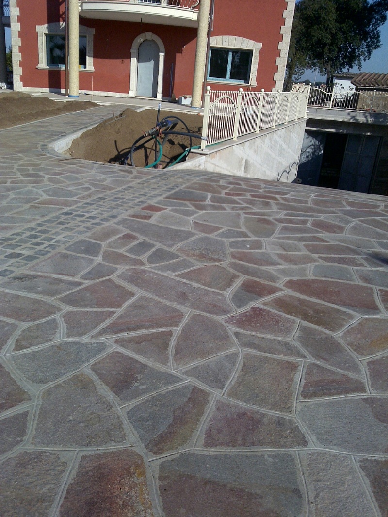 Fornitura e posa in opera di lastre di porfido, tipo opera incerta ( pezzame/bollettonato )spess. cm 3/5, su malta cementizia. Compresi tutti i materiali e la posa in opera.