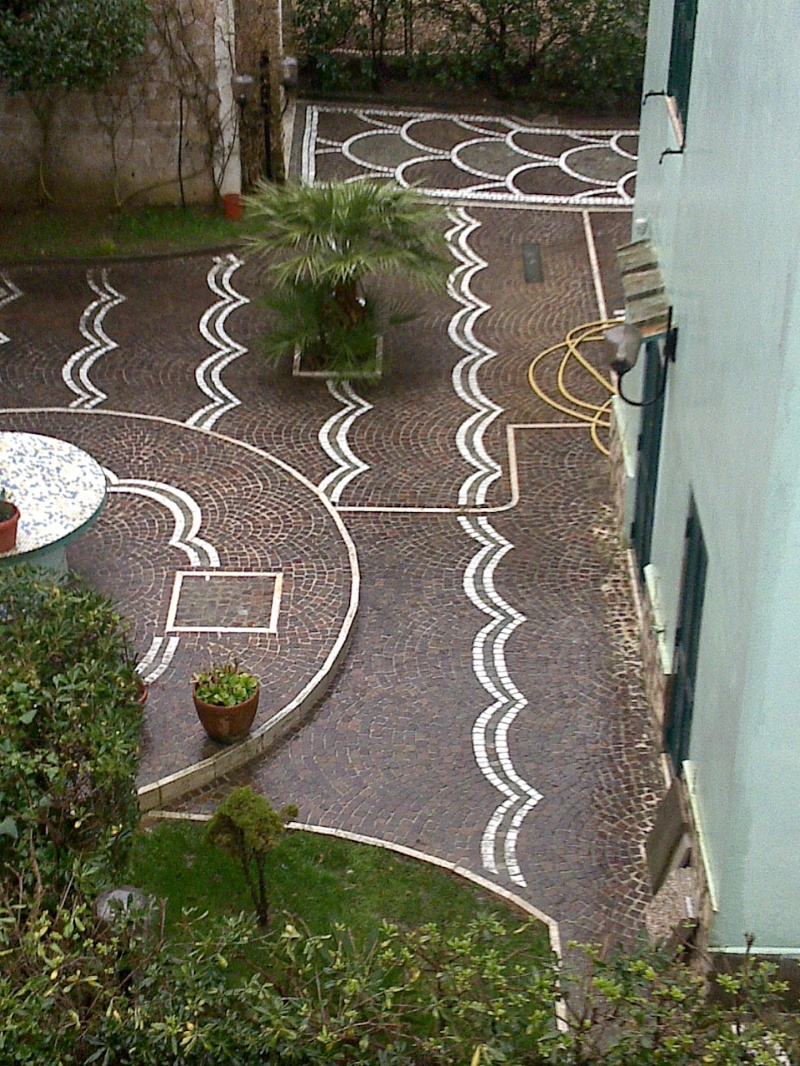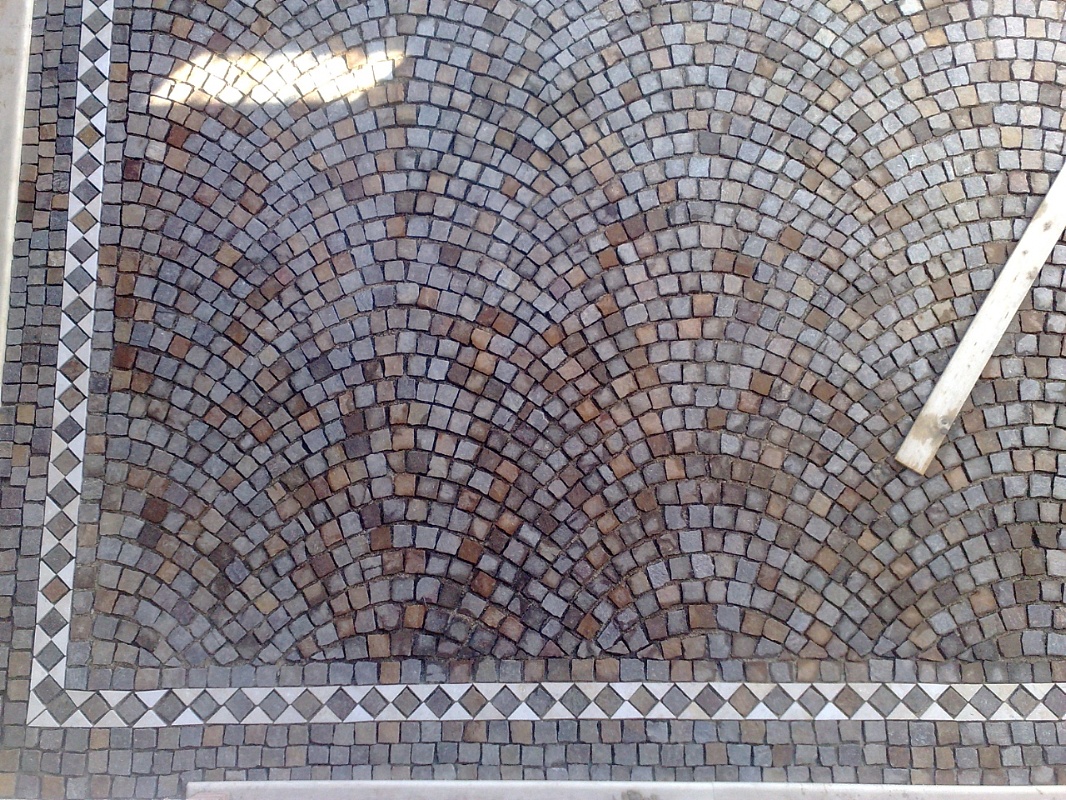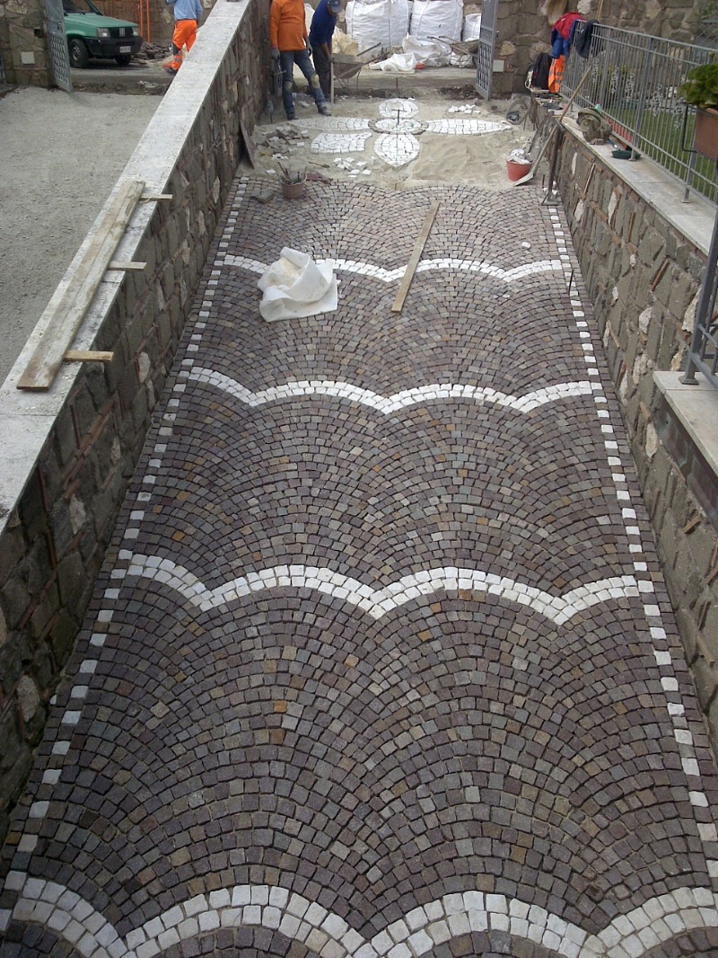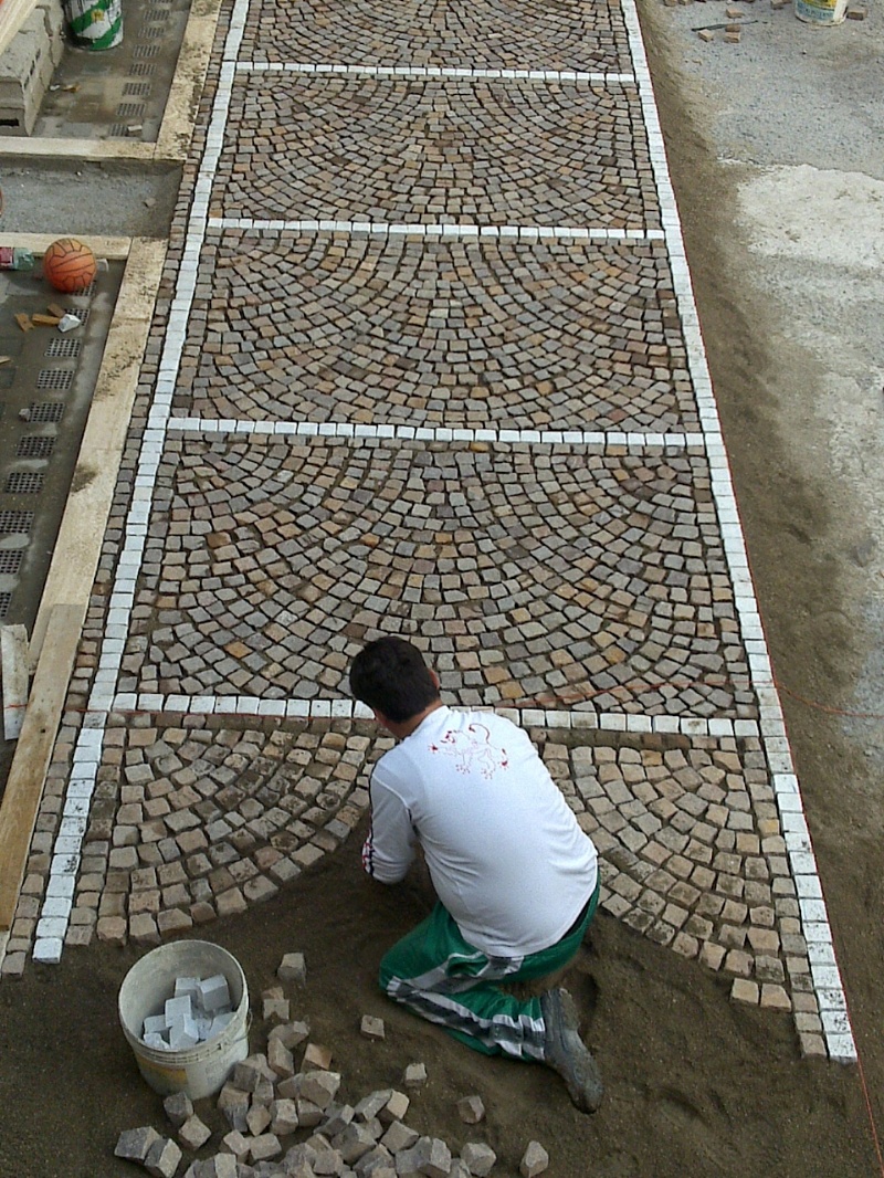 Fornitura e posa in opera di cubetti di porfido, tipo 5/8, posati ad " archi contrastanti " su letto di sabbia e cemento. Comprese tutte le forniture dei materiali e la posa in opera.