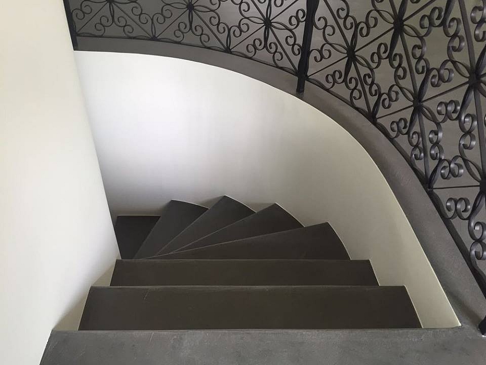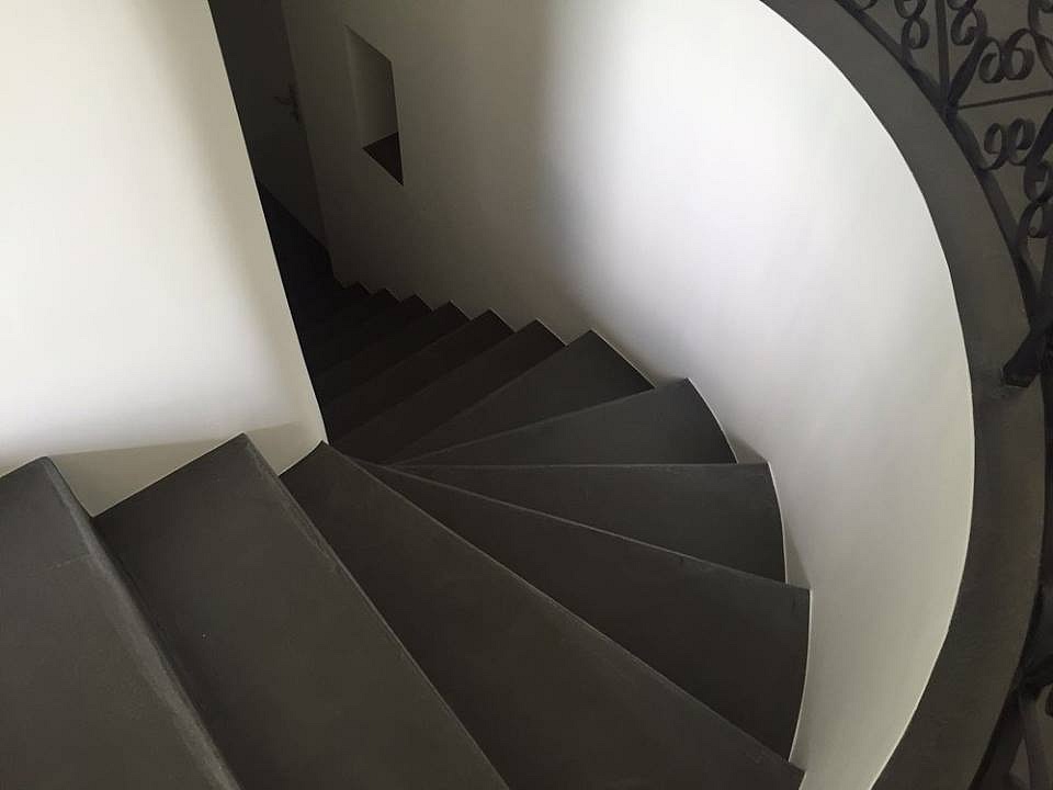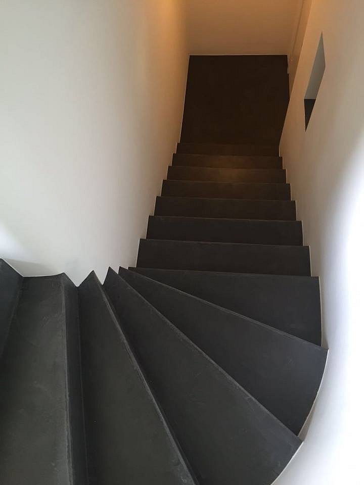 Posa pavimenti e rivestimento scala in microcemento su ceramica esistente nei colori olive grey 50% e nero 50%