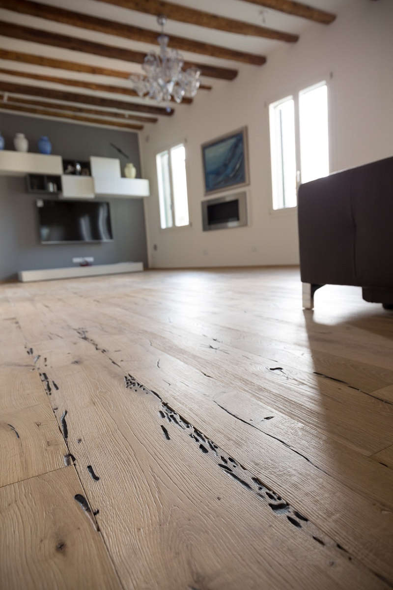 L’abitazione ha uno stile elegantemente contemporaneo, dove ogni elemento è esaltato dall’esclusivo pavimento in legno di Briccola di Venezia.