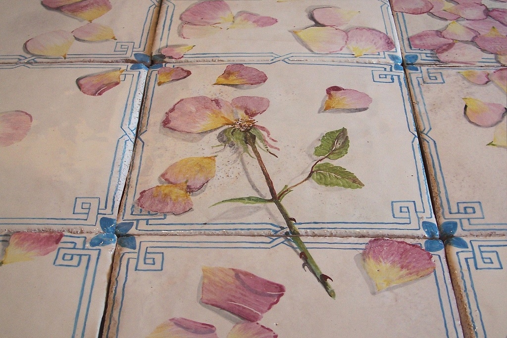 Pavimento in maiolica dipinta a mano realizzato riproducendo un antico pavimento scoperto di recente in una villa siciliana. L'originale è opera del Pittore Napoletano dell'800 Filippo Palizzi che regalò all'amante una stanza interamente pavimentata con petali di rosa che alcuni putti,affrescati sul soffitto, nei loro giochi lasciano cadere.