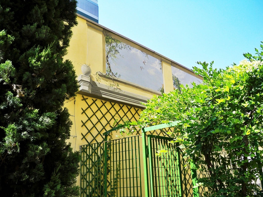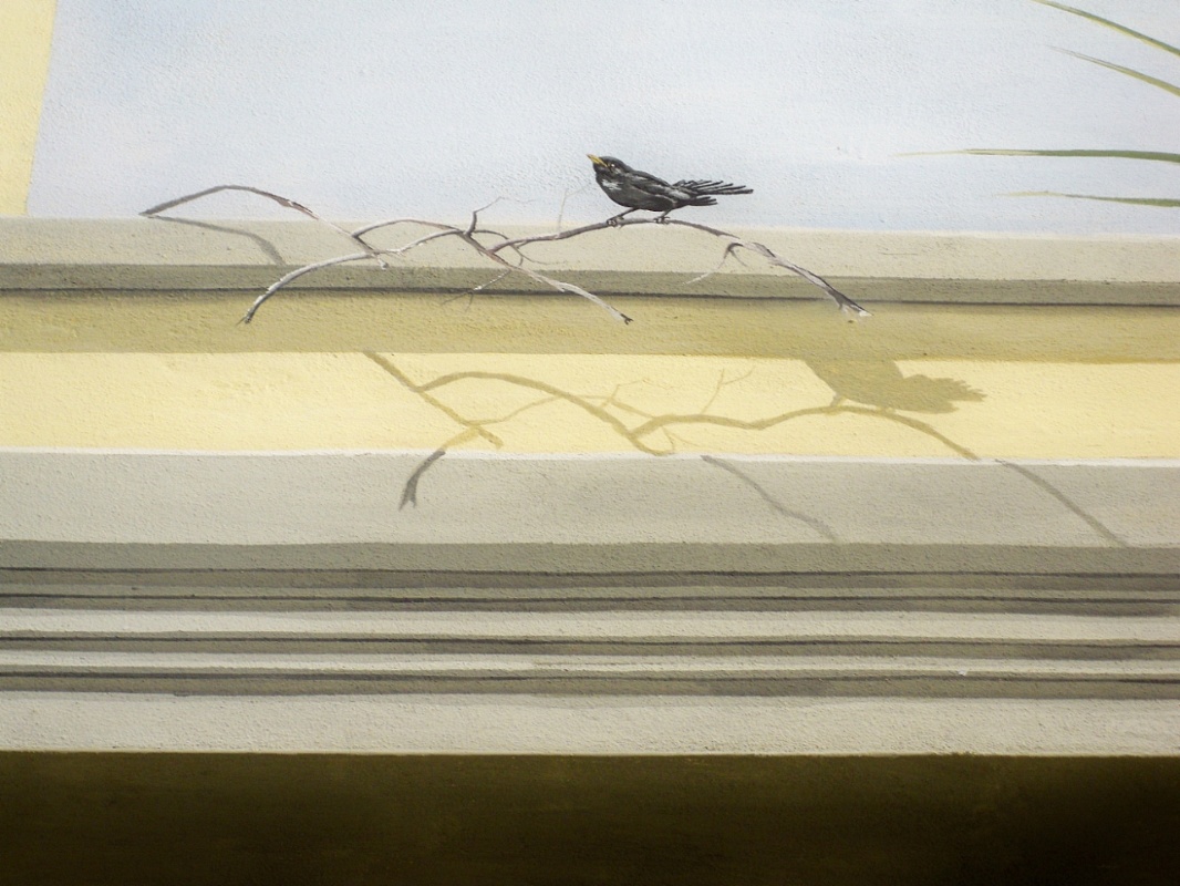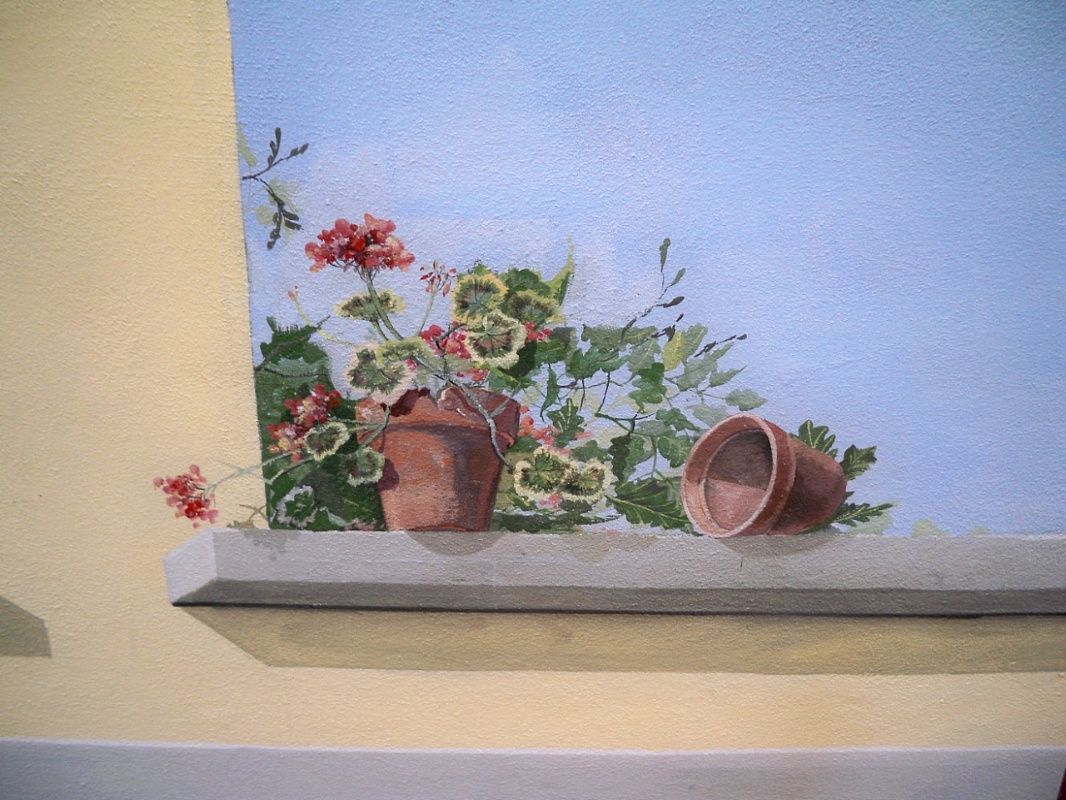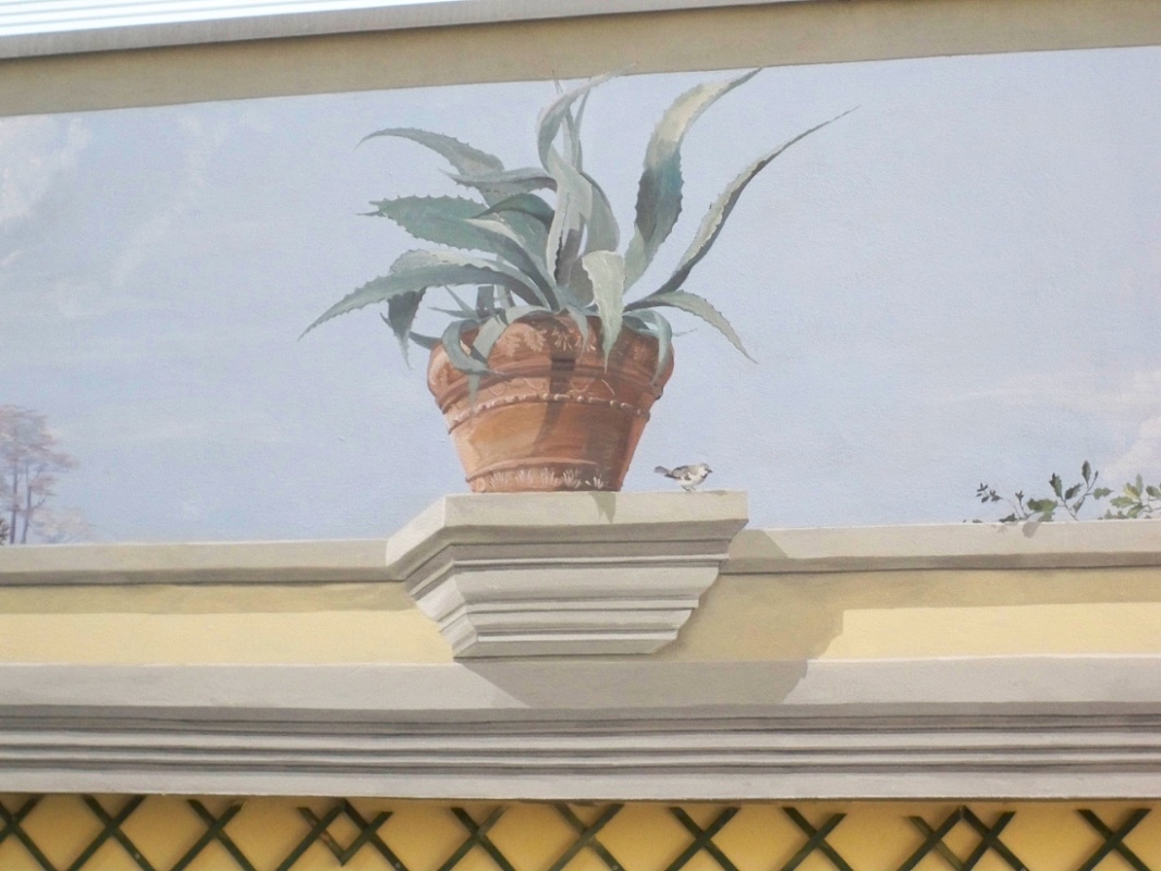 Tecnicamente il lavoro è stato eseguito con i colori ai silicati resistenti alle intemperie in quanto il trompe l'oeil è all'esterno.