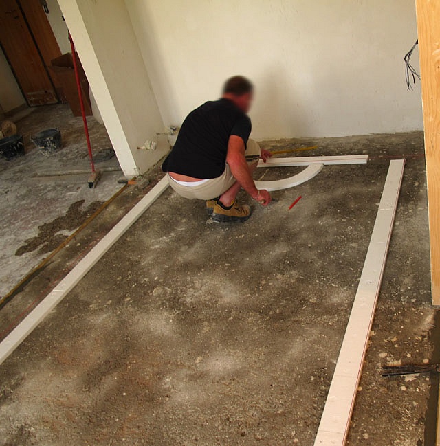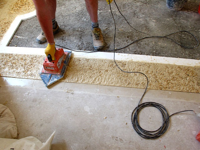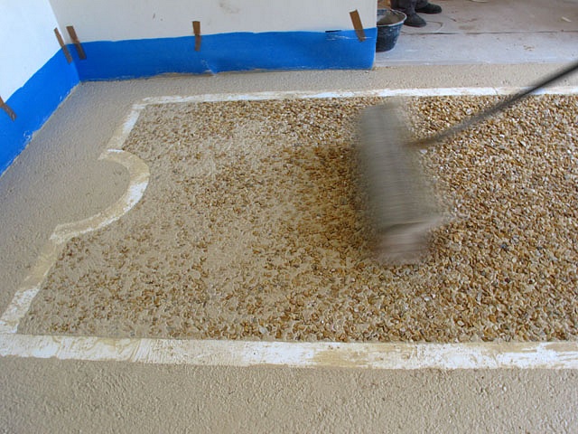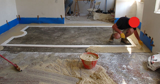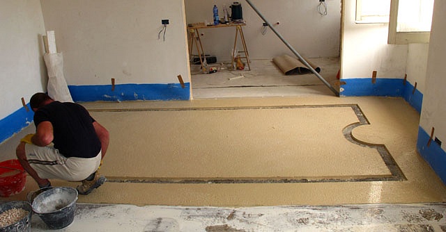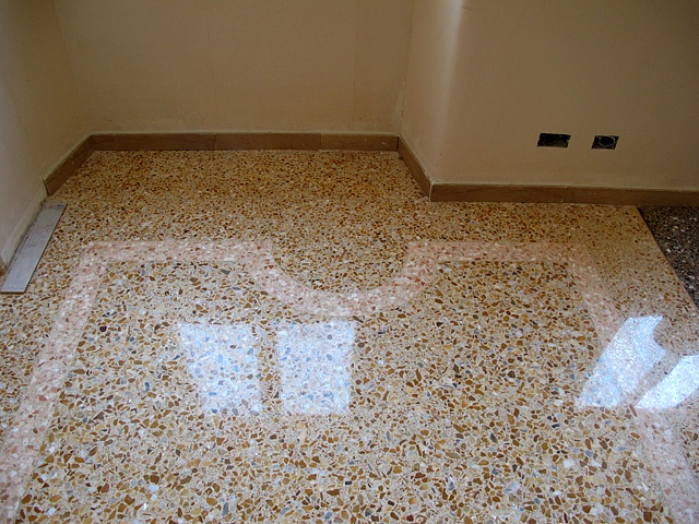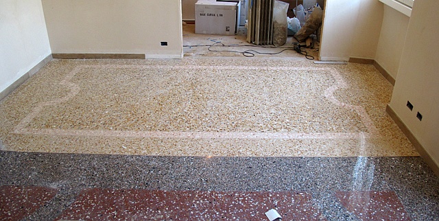 Pavimento/terrazzo/aeminato alla veneziana,dopo aver eralizzato il massetto di cemento abbiamo posizionato le sagome per realizzare la cornice perimetrale, in seguito abbiamo effettuato la gettata con garniglie di colore e dimensione specifiche,seminato le graniglie di dimensione più grossa, battuta e rullata, in seguito tolto le sagome, gettata la fascia di colore diverso, seminata, battita e rullata in fine levigato il tutto con finitura satinata.