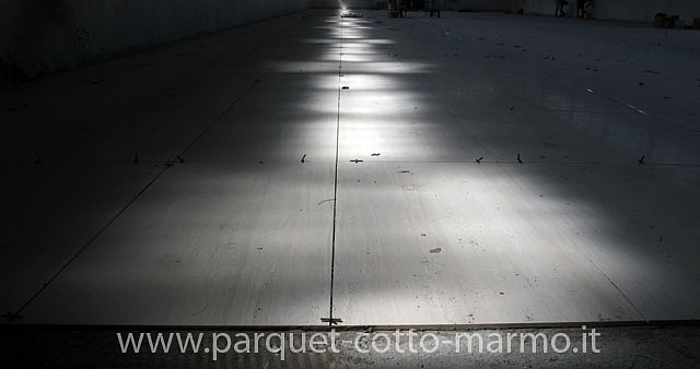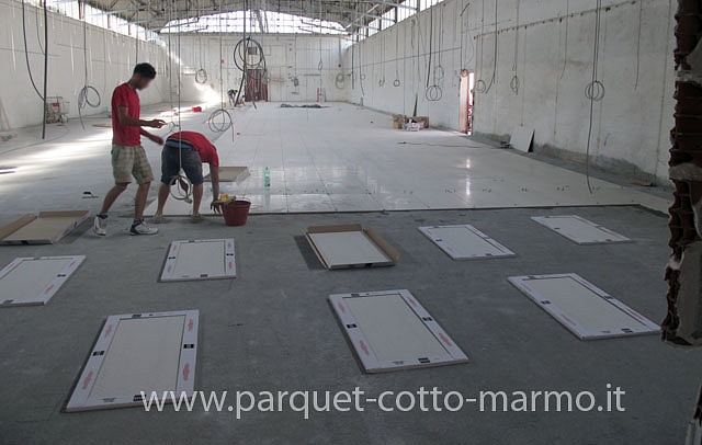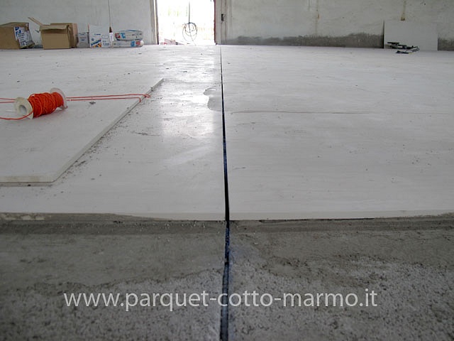 Pavimento in gres porcellanato grande formato.In questo capannone dove c'era un massetto industriale, dopo aver fatto un nuovo massetto premiscelato, la DD.LL vista la grande superficie(c.a.mq.1000), ha pensato di mettere un pavimento in gres porcellanato 120x60,pertanto dopo aver fatto i tagli sul massetto e inserito un giunto di dilatazione ogni 4.80x4.80 abbiamo iniziato a posare il gres con un collante specifico facendo la doppia spalmatura e inserito un giunto di dilatazione siliconico in corrispondenza dei tagli sottostanti. vedi nostra pagina