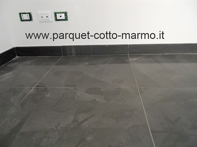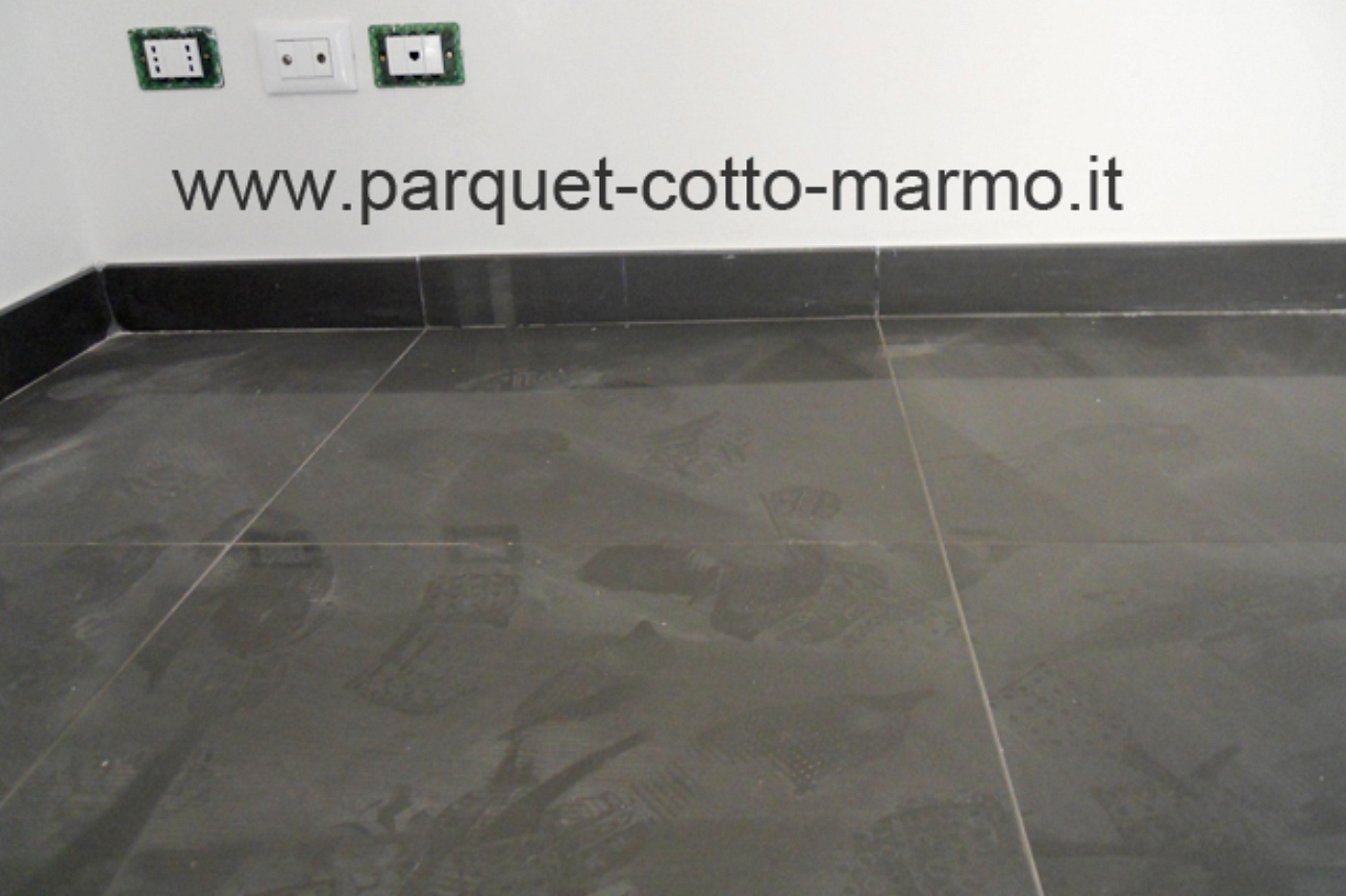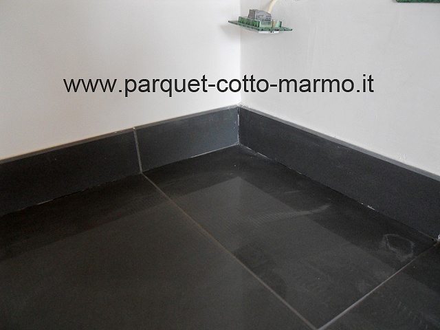 Pavimento in gres porcellanato.In questo lavoro si è reso necessario, per un errato tono-colore fornito dalla fabbrica, smantellare e posare nuovamente un pavimento in gres porcellanato levigato antracite. Pertanto abbiamo iniziato a togliere il vecchio pavimento, steso un autolivellante per riportare il piano ed infine posato con una colla specifica e i livellatori il nuovo pavimento in gres porcellanato con il relativo battiscopa ed infine abbiamo lavato e trattato il gres con un prodotto specifico con leggero effetto bagnato.