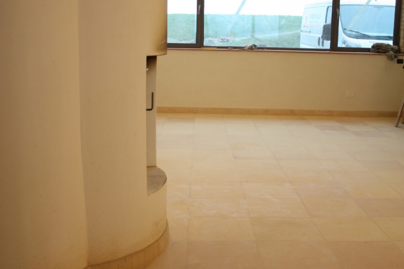 Cotto fatto a mano con argilla chiara e stonalizzata. Superficie levigata in opera.
