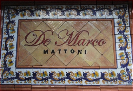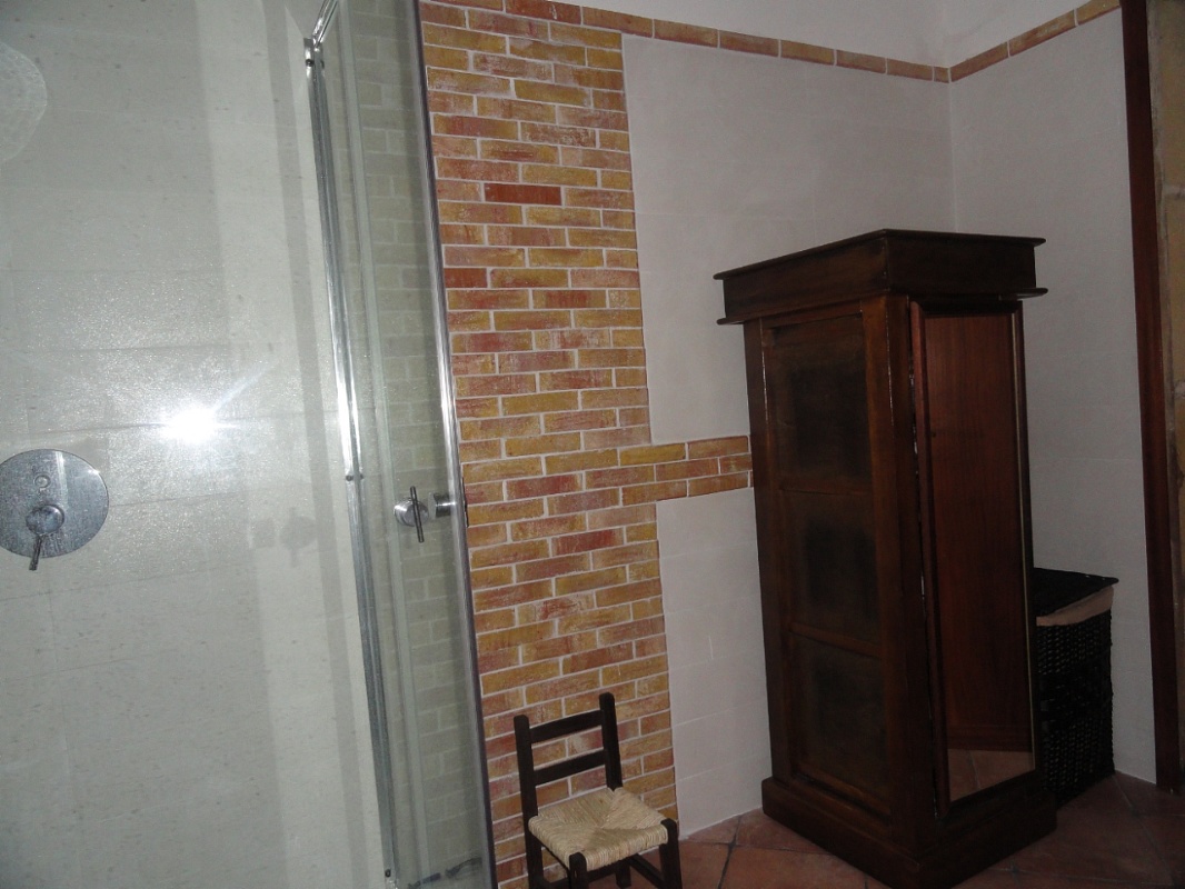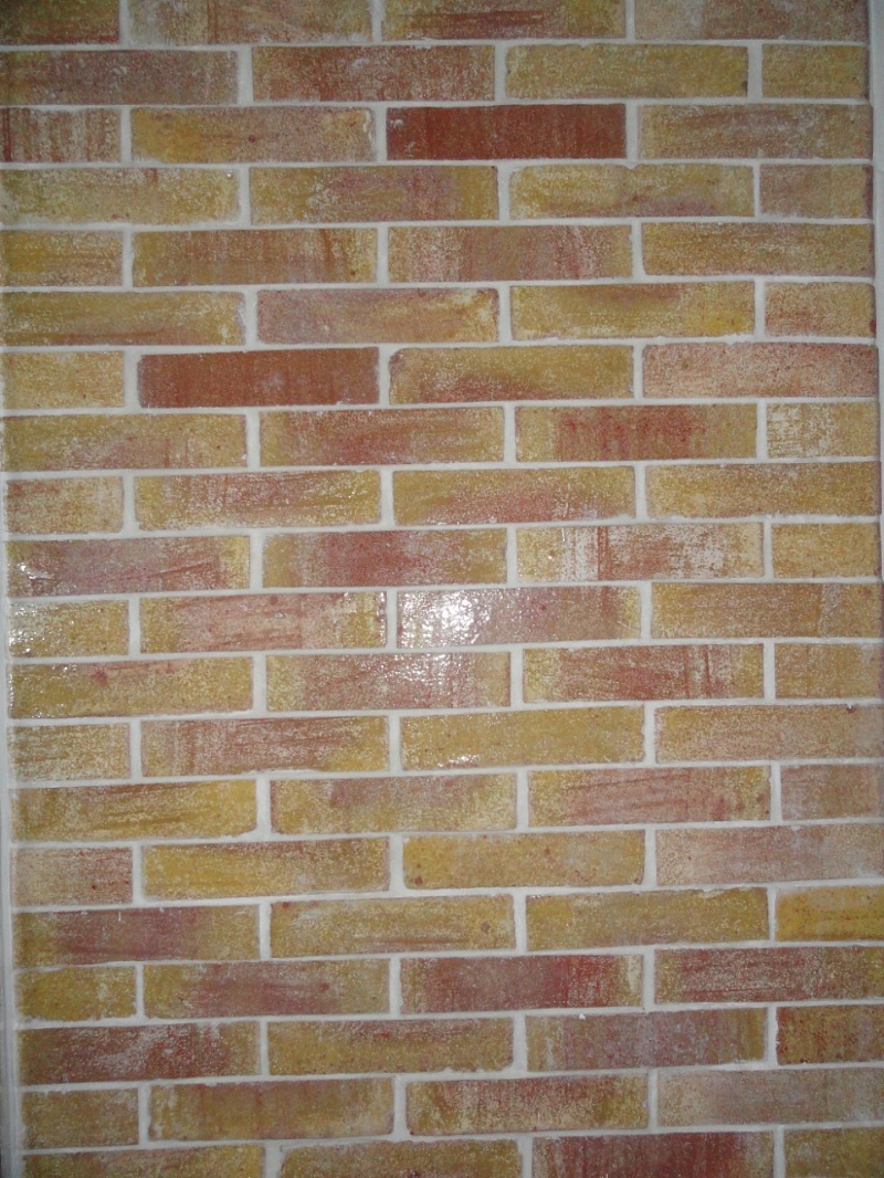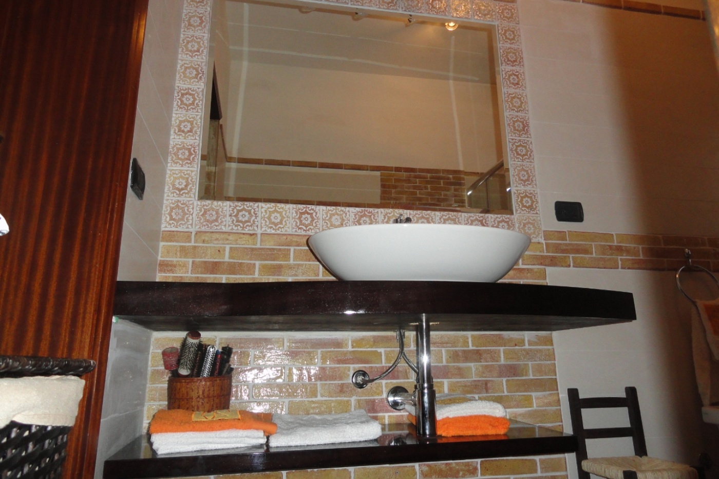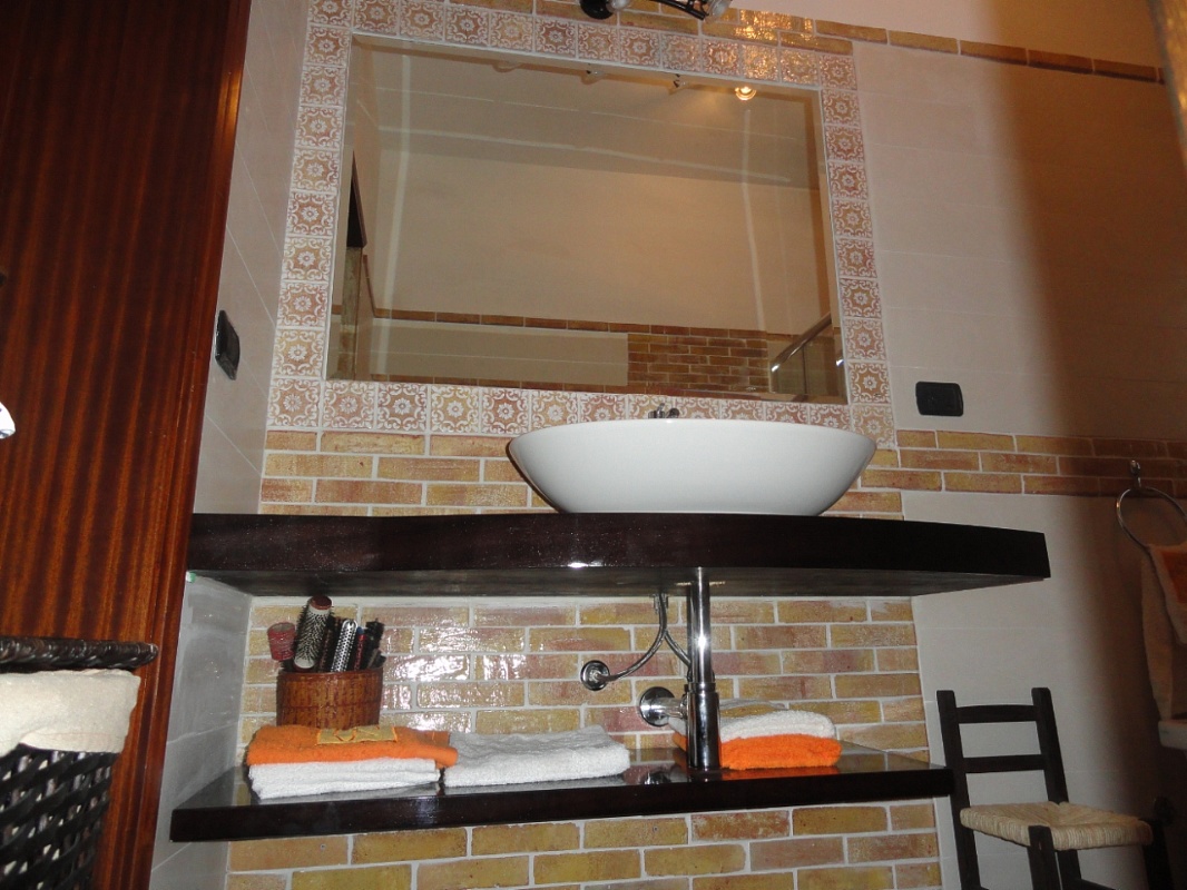 Rivestimento per bagno con mattoni a facciavista e cornice di maioliche decorati a mano.