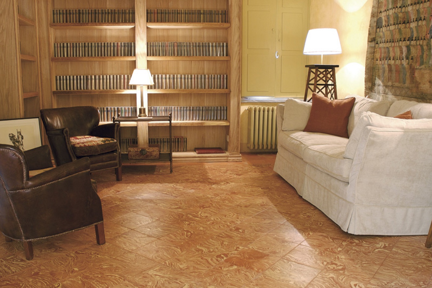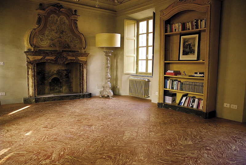 La caratteristica di questo pavimento è la presenza contemporanea nelle mattonelle di due argille di diversa composizione, che dopo la cottura manifestano colorazioni rosso-arancio e bianco-paglierino ben distinte tra loro.