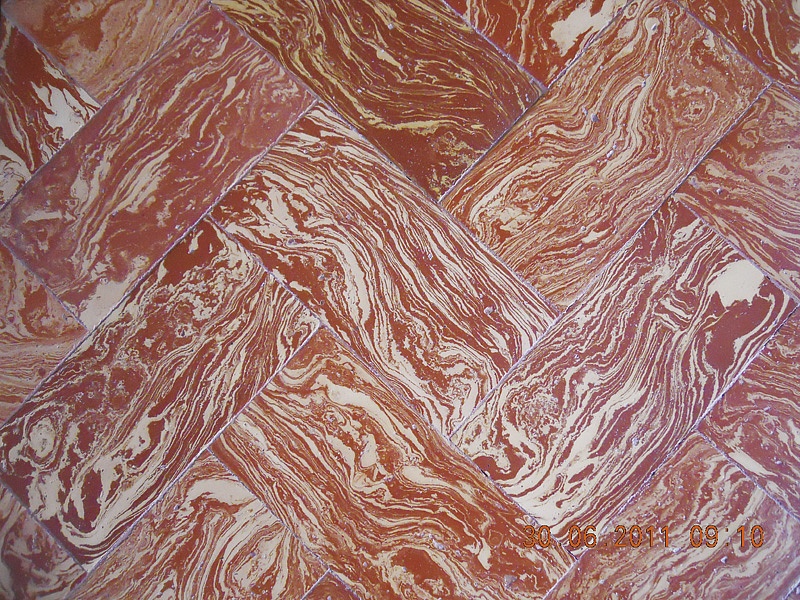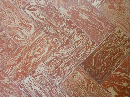 La caratteristica di questo pavimento è la presenza contemporanea nelle mattonelle di due argille di diversa composizione, che dopo la cottura manifestano colorazioni rosso-arancio e bianco-paglierino ben distinte tra loro.