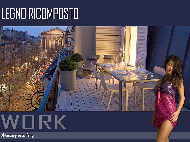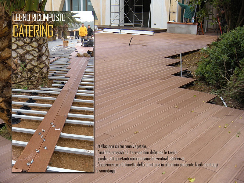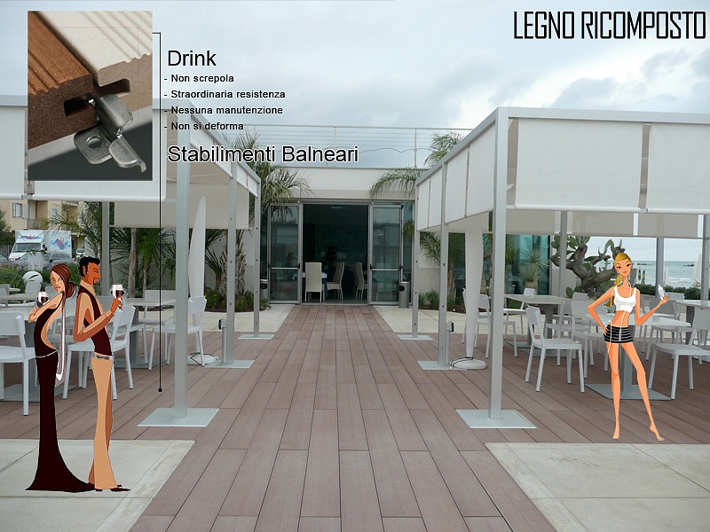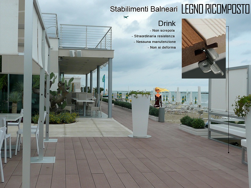 Pavimento in listoni per esterno in legno ricomposto. Nessuna manutenzione,non scheggia,pochissima dilatazione,