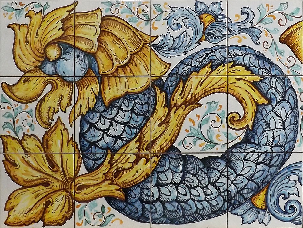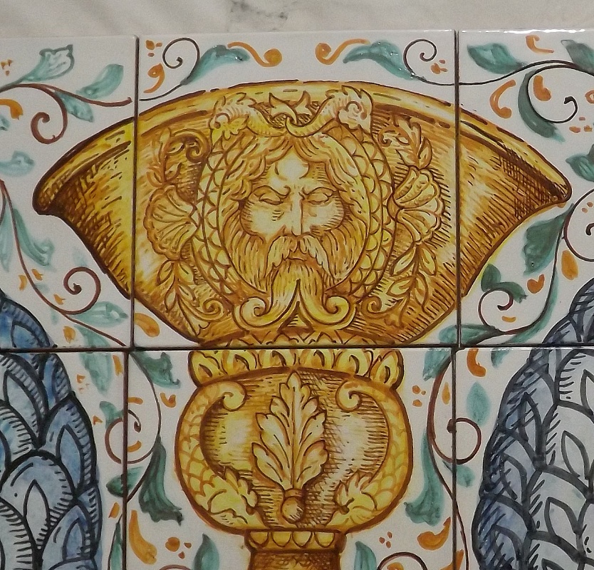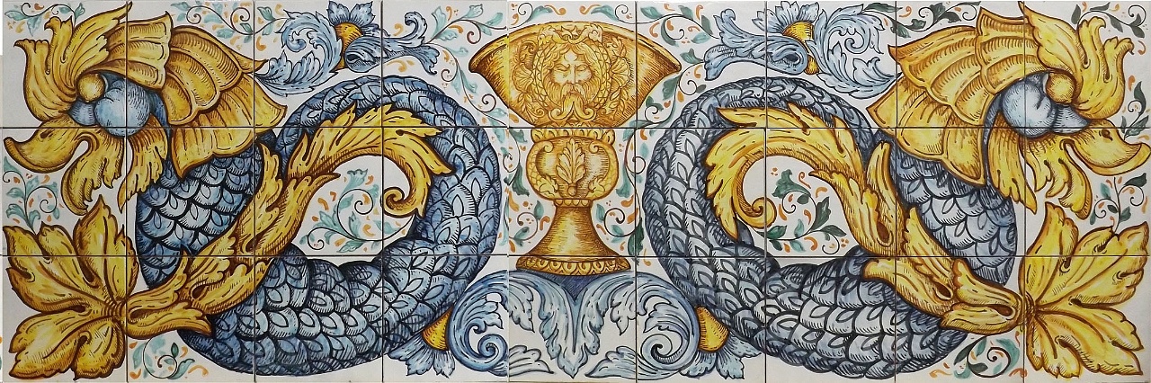Pannello in maiolica dipinto a mano,realizzato per una piscina.Lunghezza totale 9mt