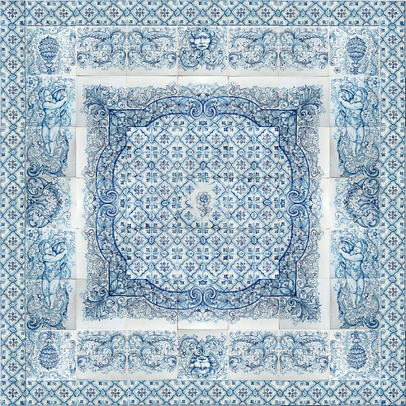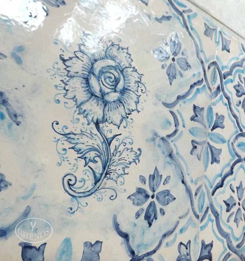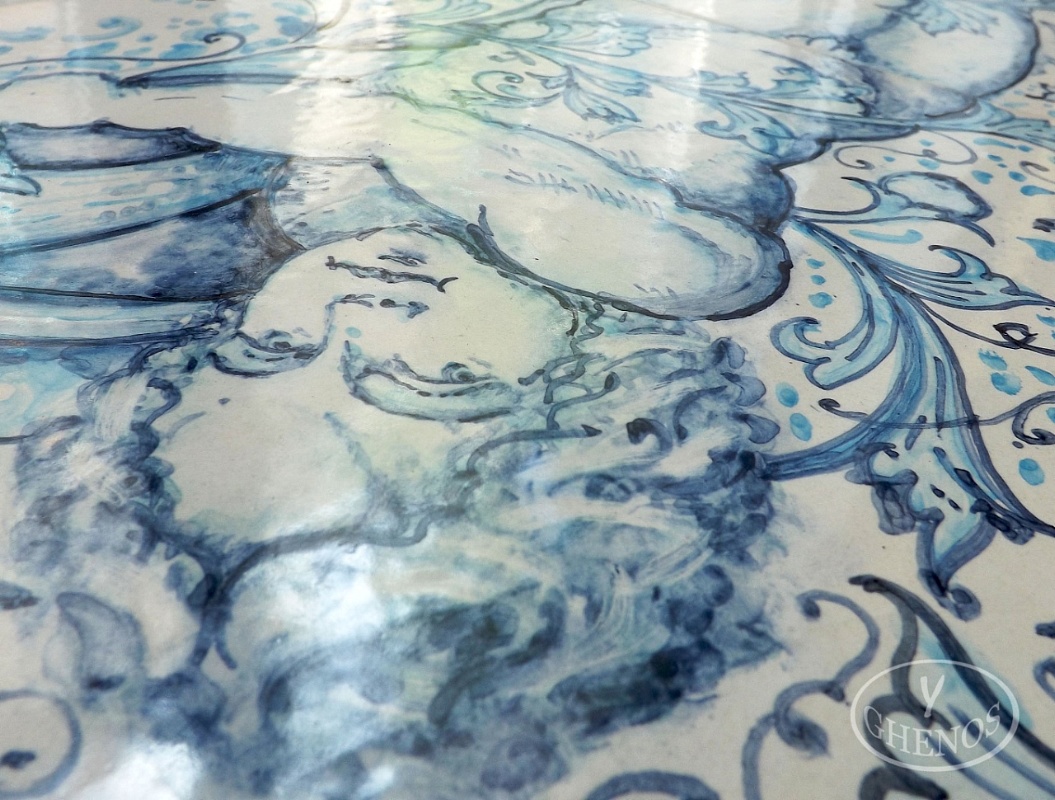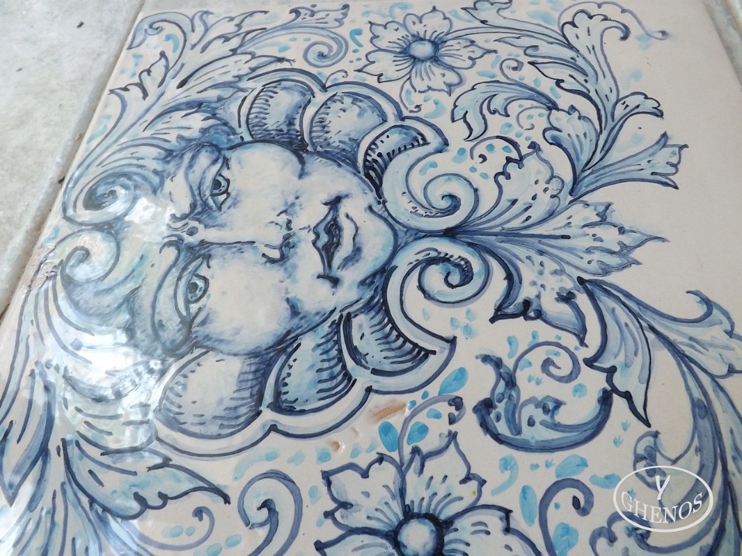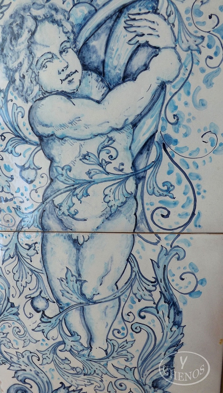 Pannello in maiolica dipinto mano,composto da 49 mattonelle cm30x30, 28 mattonelle cm 15x30 e 4 mattonelle cm 15x15. Composizione ispirata alle maioliche spagnole del XVII sec.