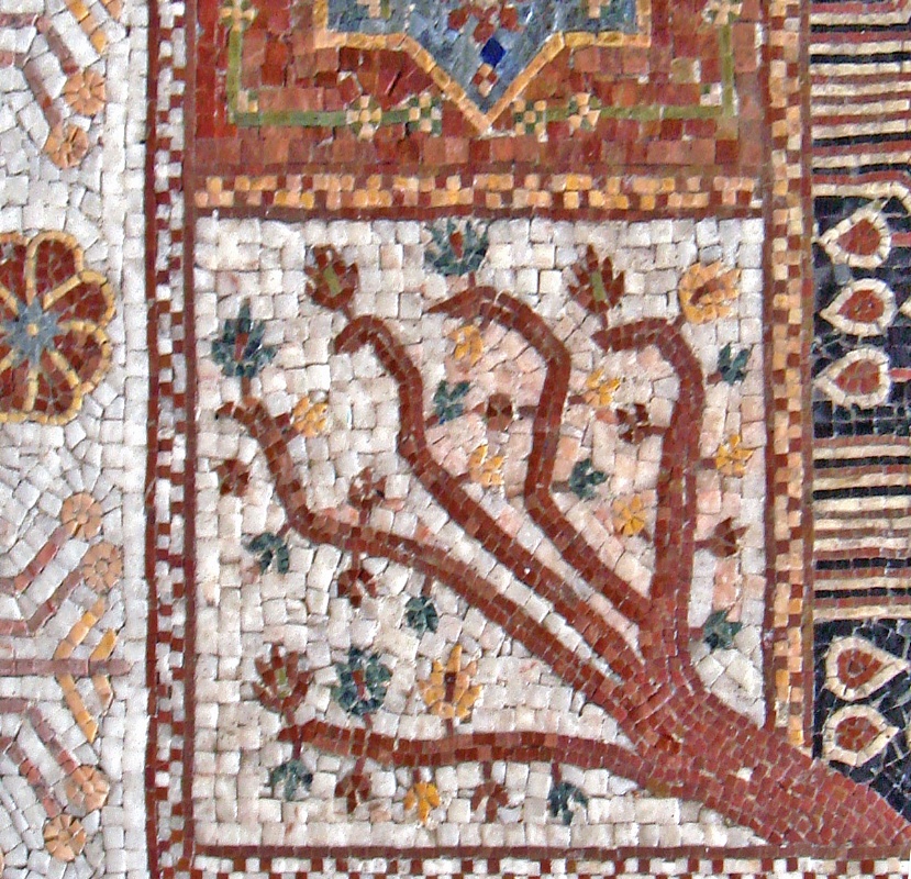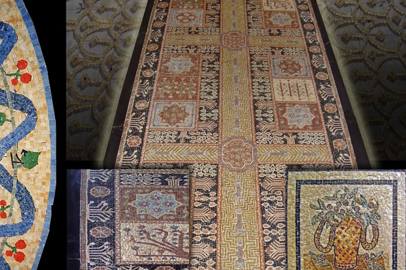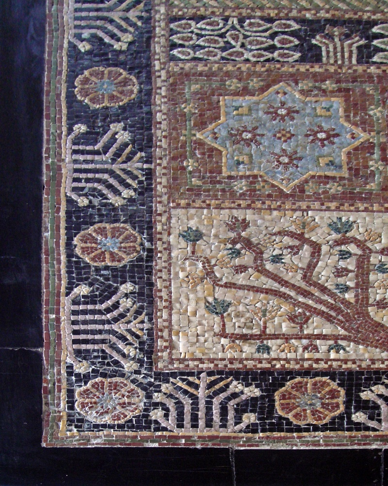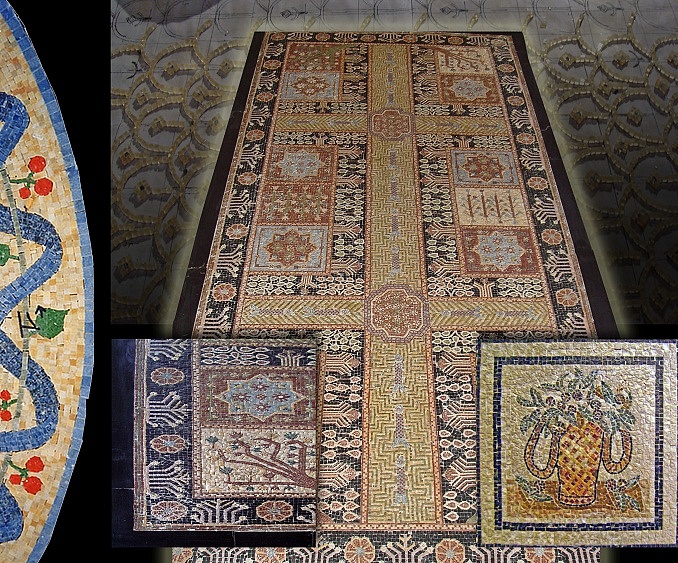 Mosaici in marmo a disegno atto a simulare un antico tappeto. Mosaico composto da microtessere di vari colori.