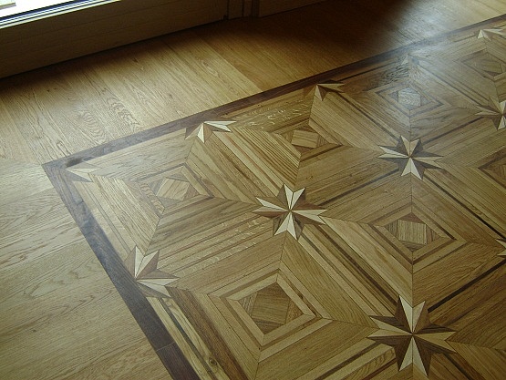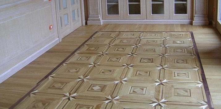 Pavimento composto da svariate essenze a formare disegno geometrico e fascia perimetrale confinante con la boiserie.