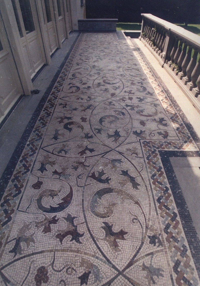 Pavimentazione esterna realizzata con tessere di mosaico in marmo seguendo disegno del committente.