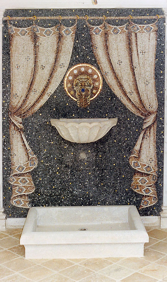 Rivestimenti bagno realizzato tutto a mosaico con tessere a formare un disegno di drappi e mascheroni