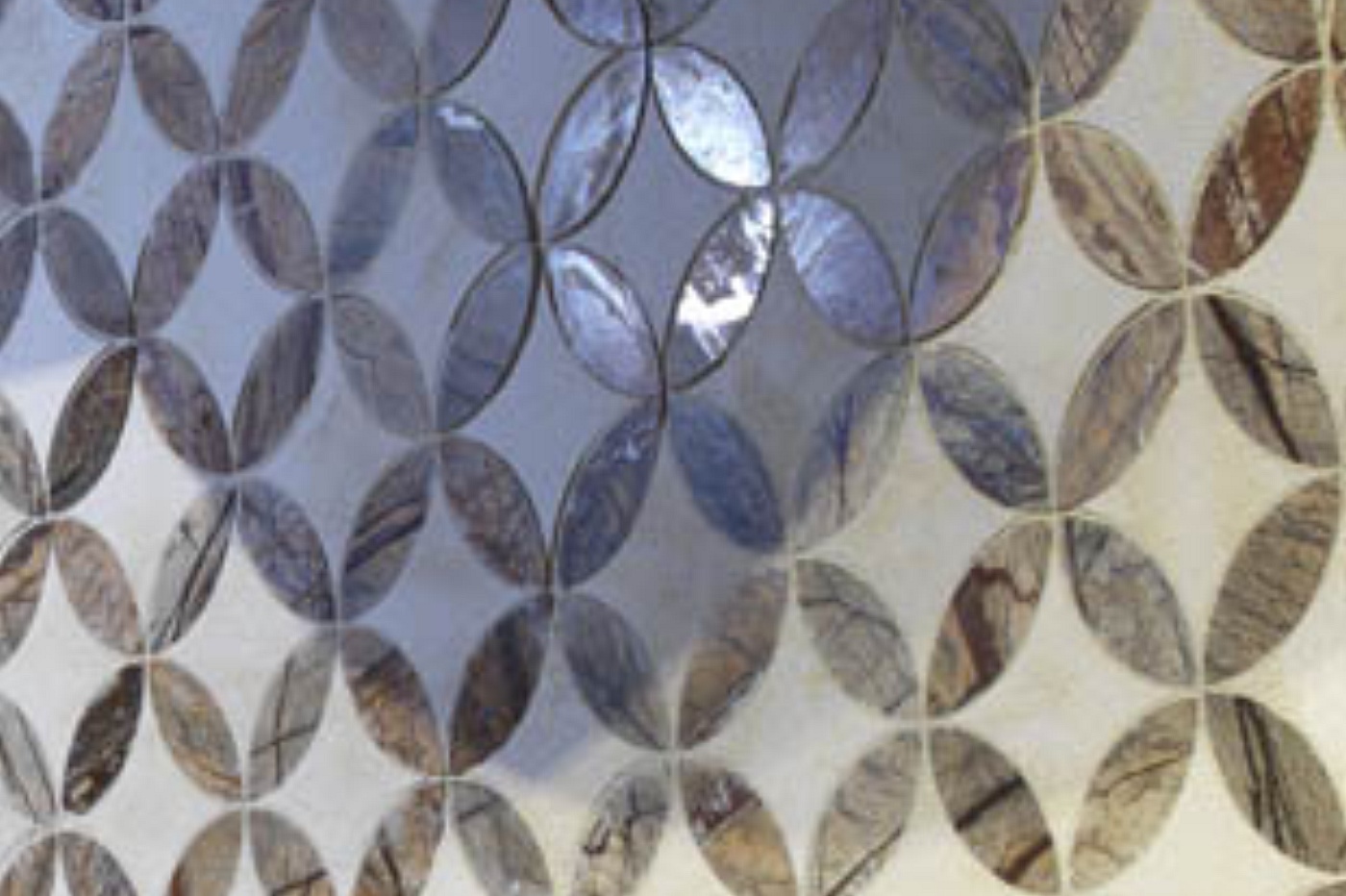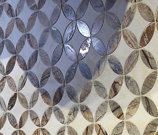 La collezione è realizzata interamente in marmo con forme tagliate ad idrogetto, fra esse contrastanti, sia per colore che per finitura. Petali lucidi in pietra preziosa orientale, si stagliano sul fondo neutro del Botticino sabbiato e creano un piacevole gioco lucido-opaco per esaltarne l'intreccio della composizione.