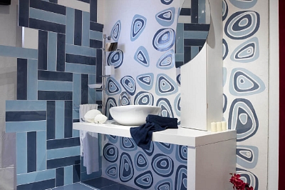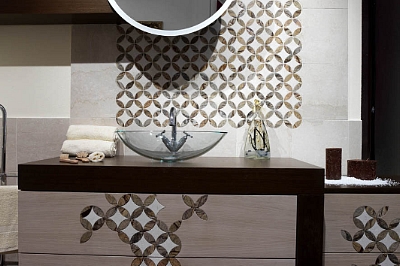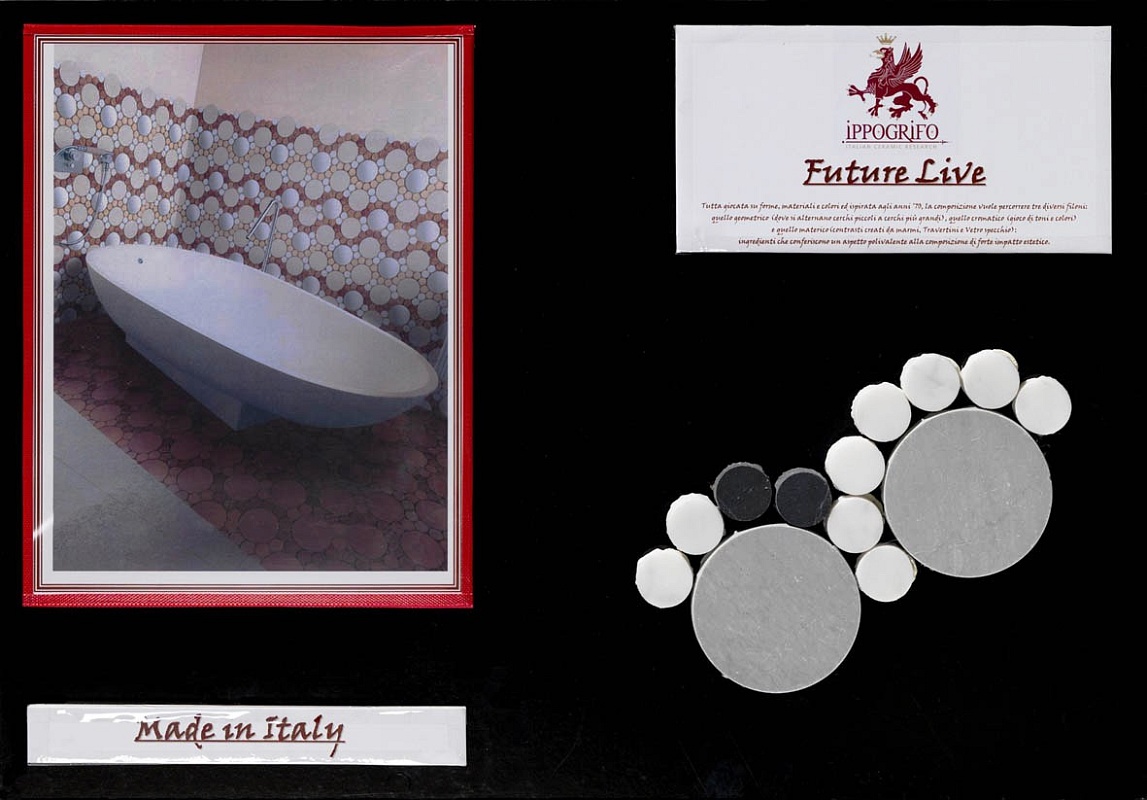 ed ispirata agli anni '70, la composizione vuole percorrere tre diversi filoni: quello geometrico (dove si alternano cerchi piccoli a cerchi più grandi), quello cromatico (gioco di toni e colori) e quello materico(contrasti creati da marmi, Travertini e Vetro specchio):