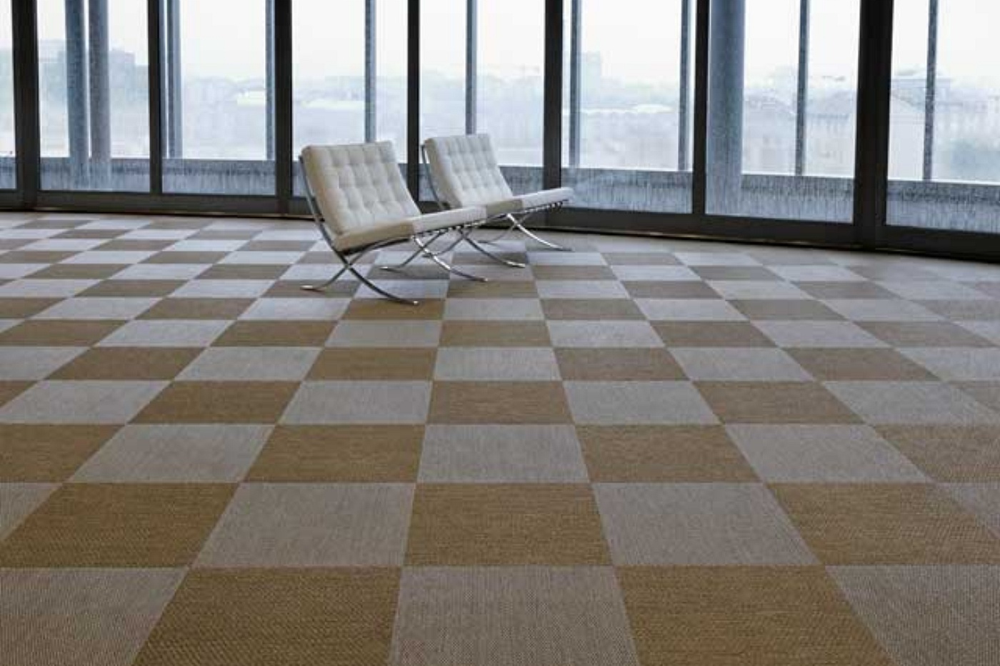 Tessuto vinilico ad effetto stuoia per pavimenti ad uso interno, con supporto in PVC e fibre di vetro.