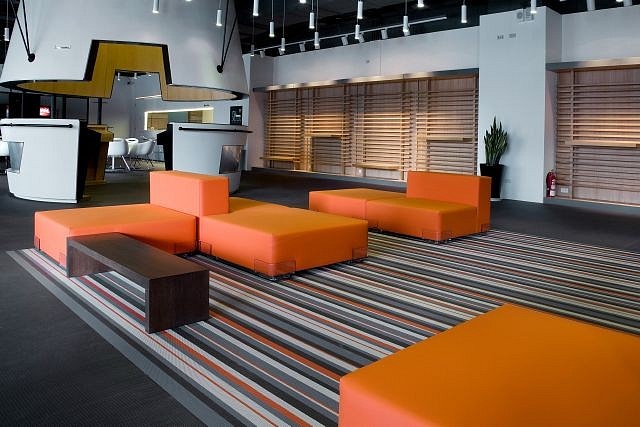 Tessuto vinilico ad effetto stuoia per pavimenti ad uso interno, con supporto in PVC e fibre di vetro.