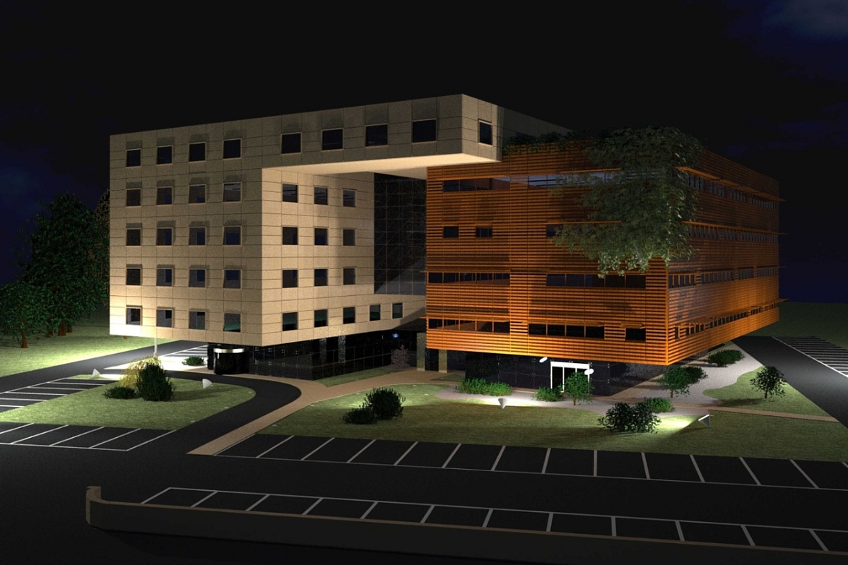 Il progetto prevede 31.500 mc fuori terra e 16.000 mc interrati. L’area adibita al nuovo centro direzionale e alberghiero prevede anche l’inserimento di alcuni servizi in comune: palestra-fitness, sale congressi, ristorazione-bar e un negozio al piano terra. Una scelta progettuale è stata quella di differenziare i volumi che identificano le due funzioni principali separando gli ingressi. Un’altra scelta è stata quella di sospendere l’edificio con la creazione di un primo piano a sbalzo, conferendo ai volumi un aspetto di leggerezza e aumentando il verde al piano terra. L’edificio è stato pensato per utilizzare con intelligenza le risorse energetiche e diminuire gli sprechi mediante una facciata ventilata e schermata da brise-soleil e da piantumazione rampicante e con una dotazione impiantistica con sistemi a recupero di calore, pannelli solari e pannelli fotovoltaici. Si è pensato per la ristorazione a un grande giardino pensile in copertura.