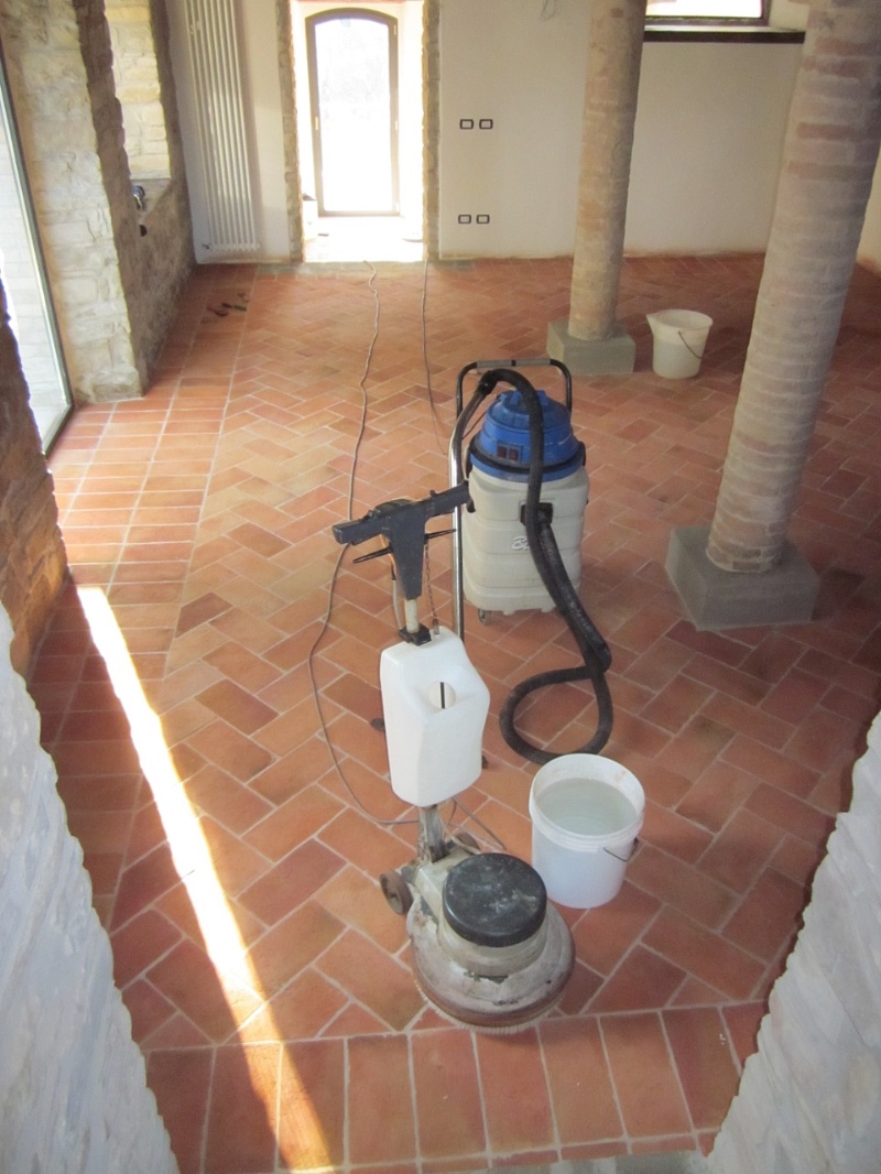 La pulizia è stata eseguita con monospazzola e dischi abrasivi con soluzione acida, al fine di ridurre ruvidezza del materiale e consentire al cliente una manutenzione ordinaria più agevole.