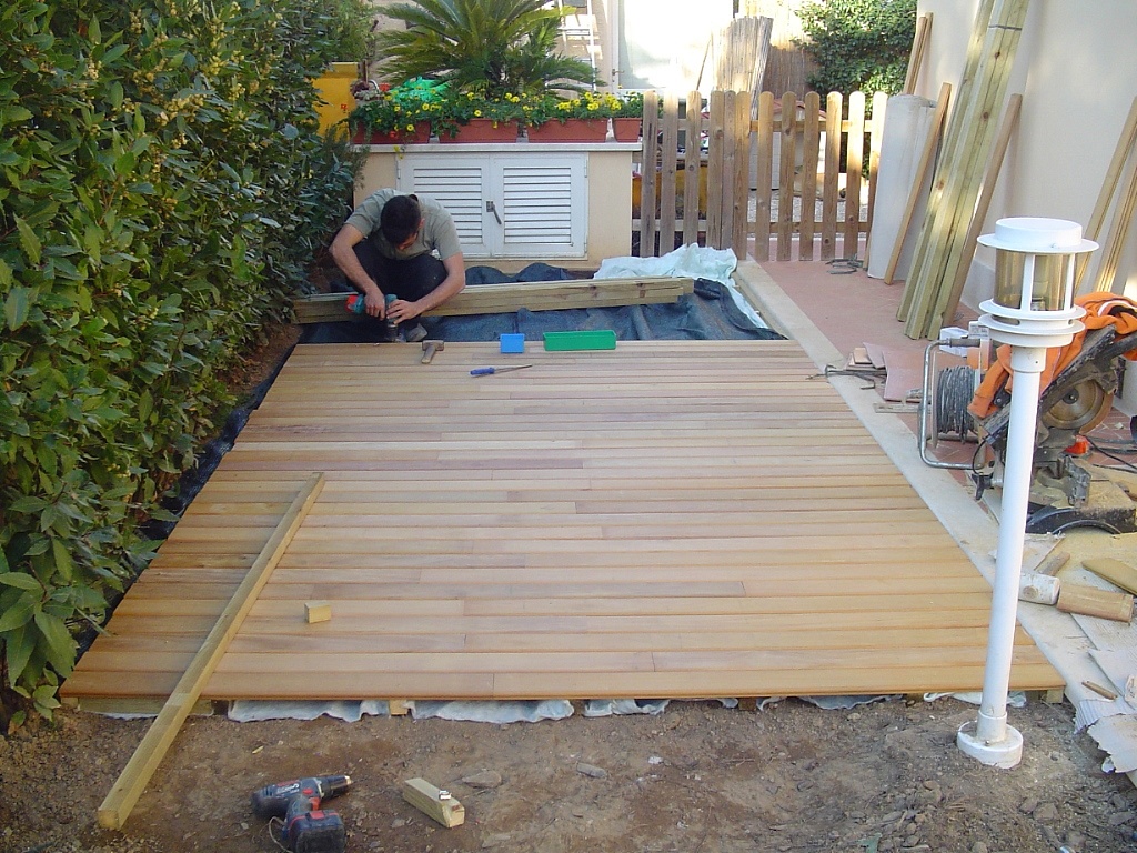 Posa di listoni in essenza Garapa su magatelli flottanti montaggio con clip a scomparsa.