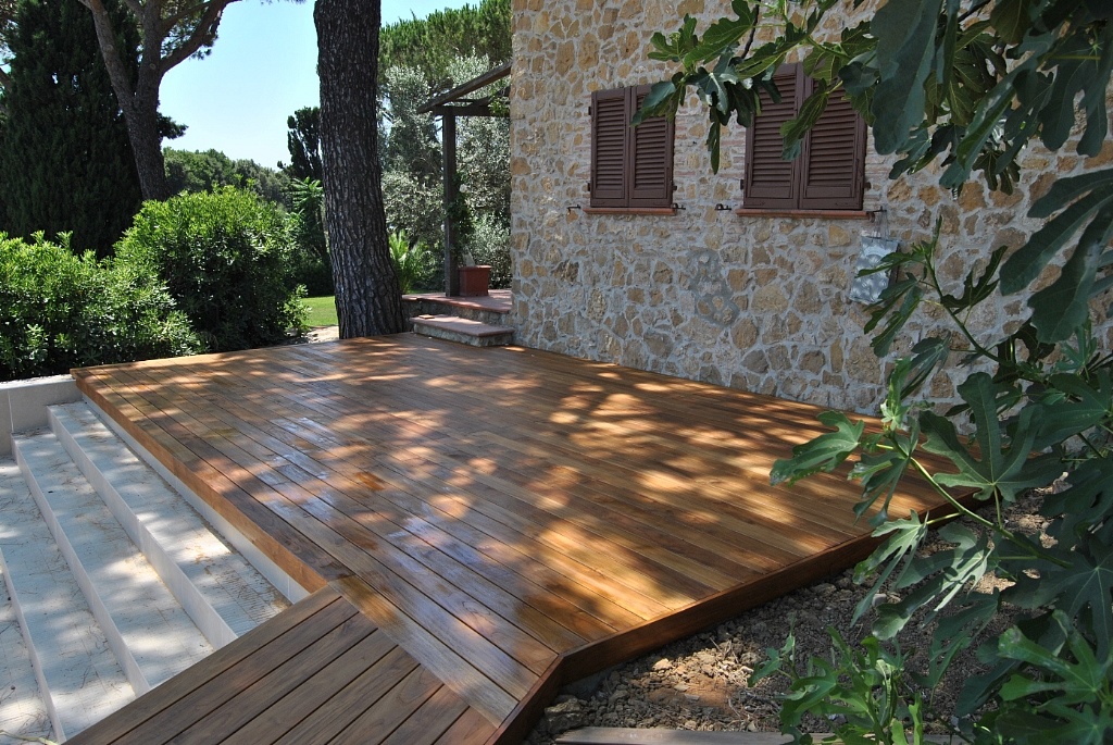 Decking Teak Burma. Listone in massello con bordi arrotondati, fresatura laterale f/f, maschiatura di testa m+f.Montaggio su magatelli flottanti. Formato 20x90/120x1000/3000 mm. Possibilità di montaggio con viti a vista o clip inox a scomparsa.