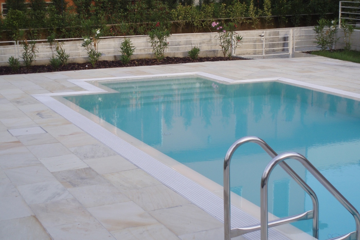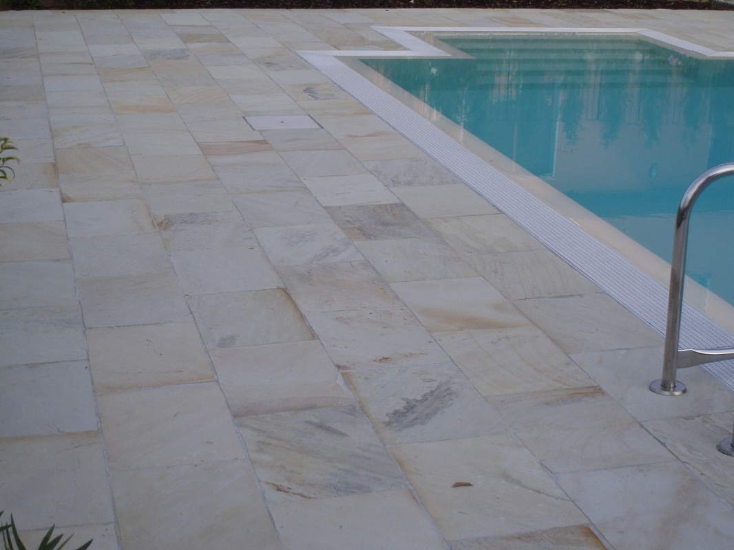 Pavimentazione bordo piscina in piastrelle di pakistana indiana, colore giallo-arancio, per le pavimentazioni bordo piscina è consigliabile un pavimento ruvido (che evita di scivolare)e duro (che non si sgretoli, visto il cloro contenuto nell'acqua)