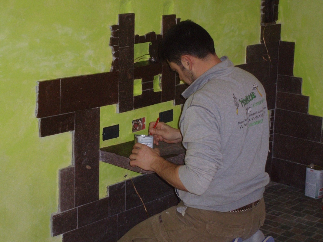 Parete interna, angolo TV, rivestita in zoccolino di porfido fiammato color bordò, con rifiniture in mosaico di spaccatello in porfido fiammato, con mensola porta dolbi in porfido, pezzo intero...pavimento in cubetti 4/6 in porfido fiammato colori misti, e piastrelle in marmo di botticino