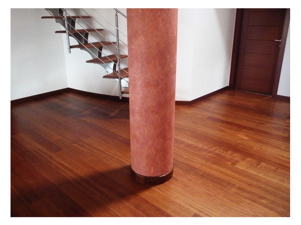 Pavimento a superlistoni tradizionali in essenza Merbau, incollati e verniciati con vernice ad acqua opaca (con prodotti a bassissimo impatto ambientale) e gradini in legno su scala in acciaio.