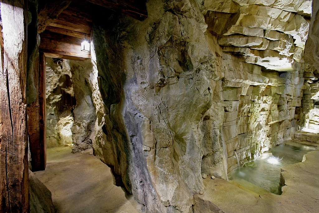 Segue la "Grotta a vapore",la sauna,la doccia emozionale e la zona relax anch'essa in roccia artificiale,ricavata in un anfratto del tunnel con panche riscaldate,anche quelle in finta roccia.