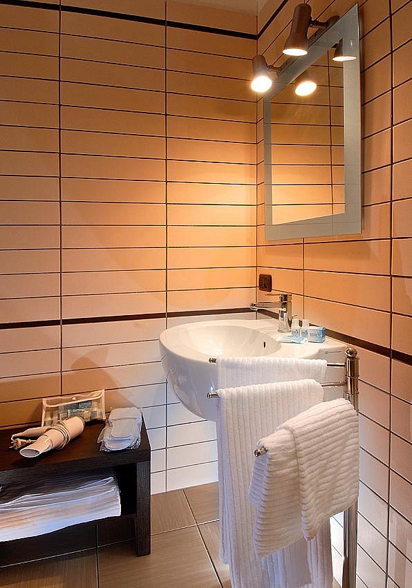 Per le stanze con affaccio sul retro dell'hotel si è pensato di valorizzarle ed impreziosirle realizzando un'area wellness interna, composta da doccia cromoterapica, sauna e minipiscina su misura, al fine di poter creare uno spazio riservato e intimo dove potersi rilassare e perdere il contatto con l'esterno.