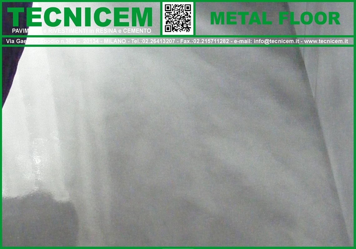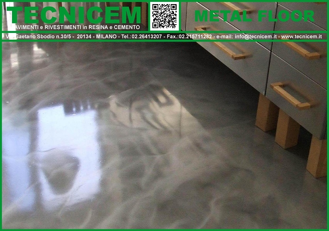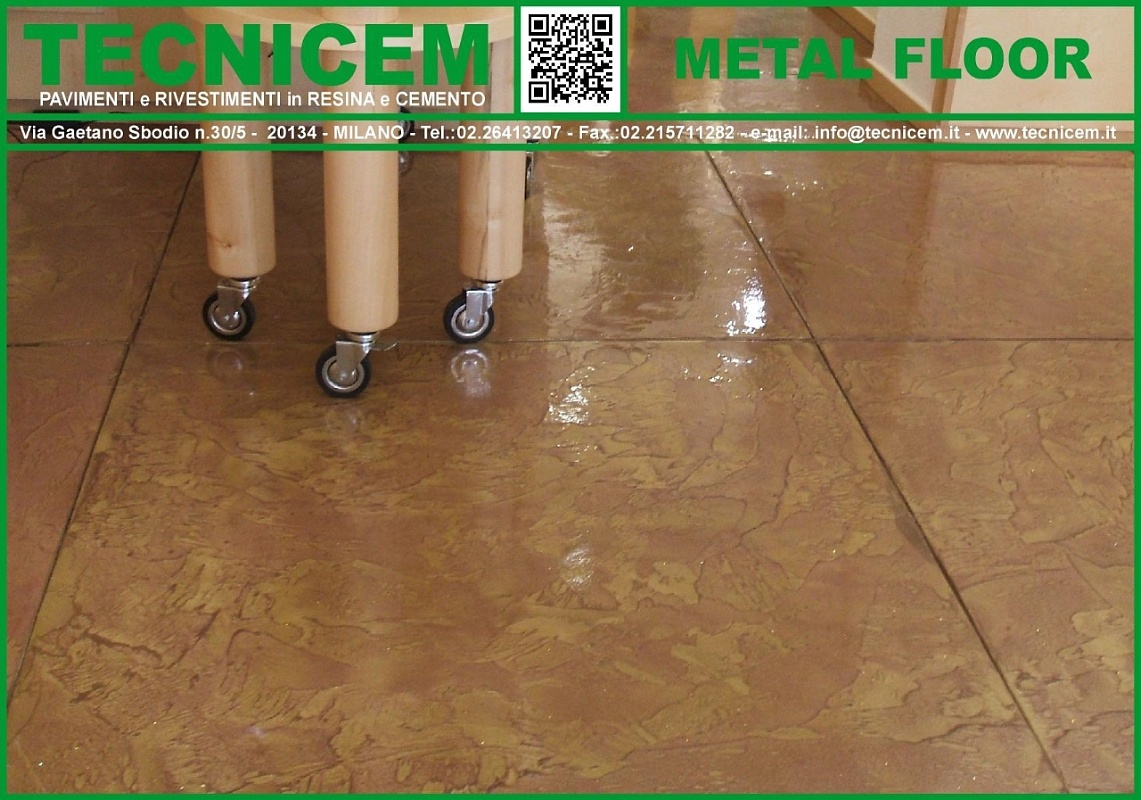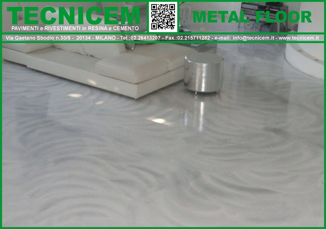 Rivestimento di finitura a pavimento, ad effetto vetrificato che utilizza, su una base di colore, resine trasparenti lucide additivate con polveri di metallo, glitter etc.