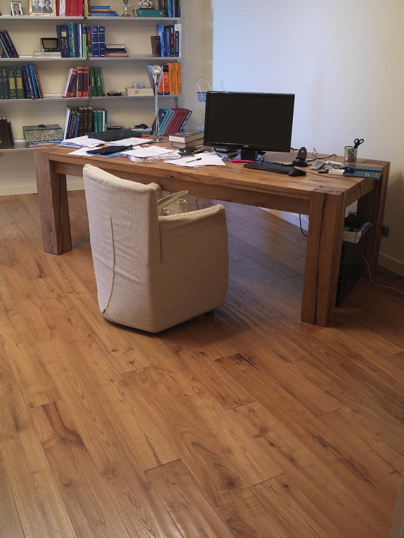 Abbiamo quindi deciso di utilizzare olmo antico di recupero oliato, cerato e piallato a mano, un legno dal colore tenue che si sposa senza contrasti con la bianchezza diffusa, aggiungendo al tempo stesso un elemento di naturalità in grado di stemperarne la freddezza.