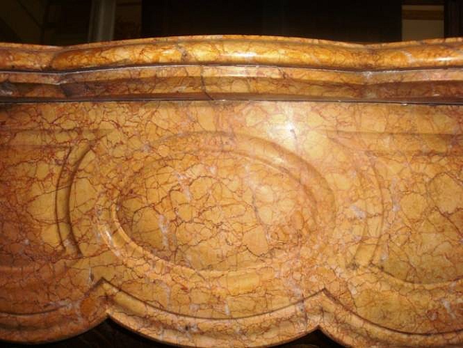 CAMINETTO POMPADOUR GALBE' IN PREZIOSO MARMO GIALLO FIORITO, BUONA CONSERVAZIONE GENERALE, PROVENIENZA PARIGI, EPOCA 1860 C.A, DOTATO DEL SUO ORIGINALE E FINISSIMO CONTROCUORE IN OTTONE SBALZATO A MANO..