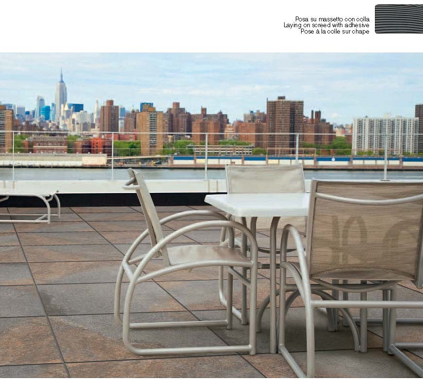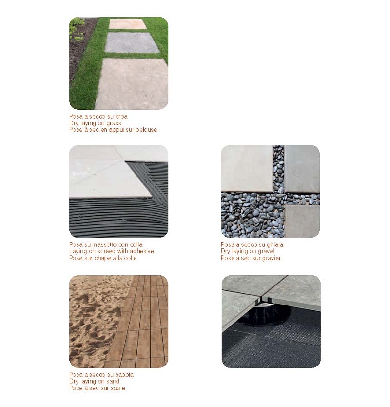 Pavimento per esterno con posa sopraelevata a secco. Materia pregiata e spessorata