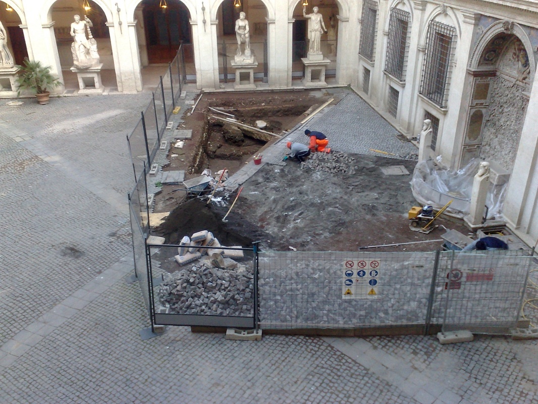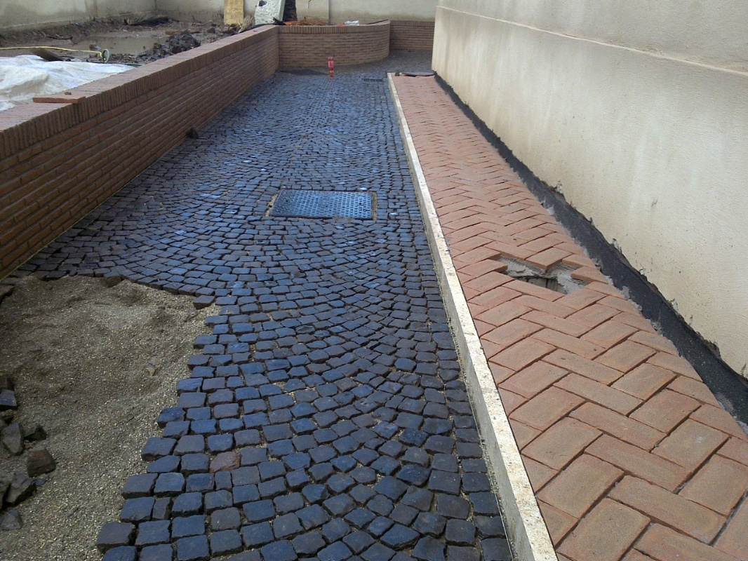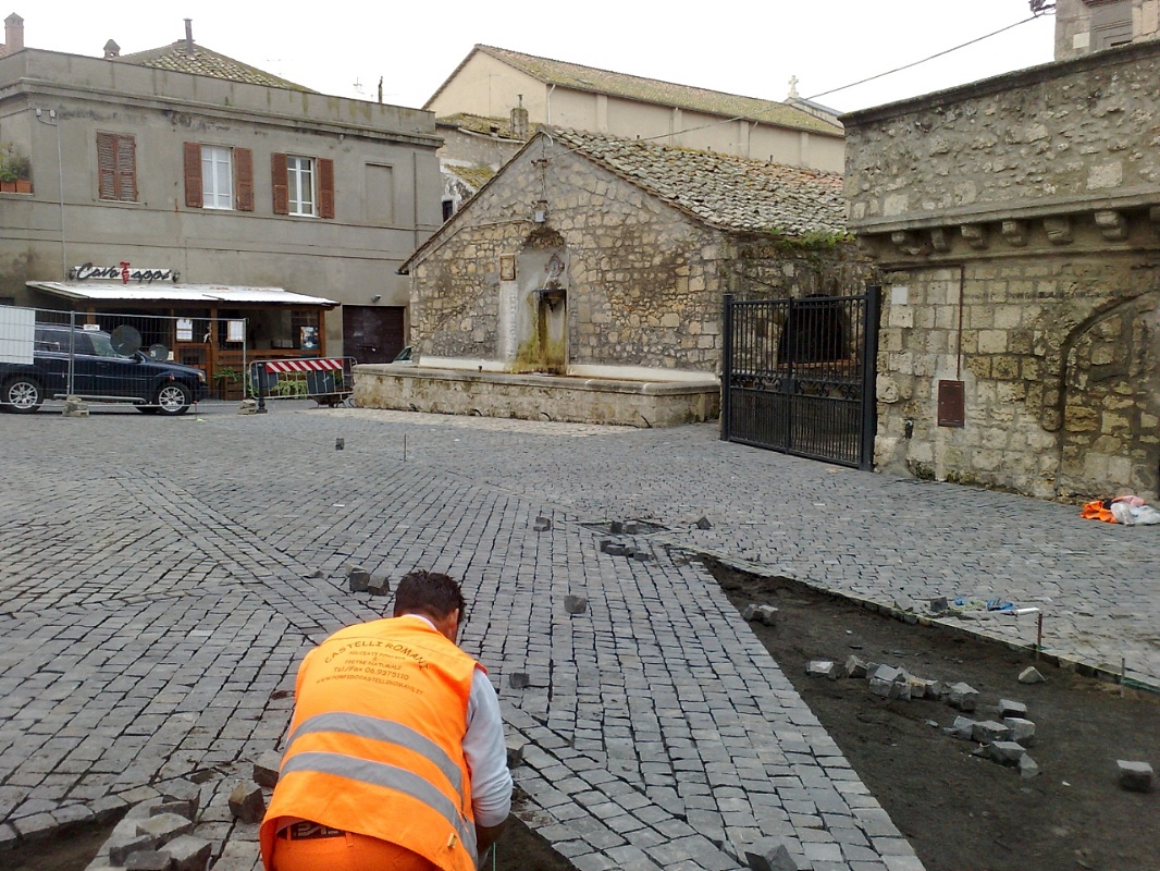 Posa in opera di pietra da recupero, selciato romano, basolato, ciottoli.