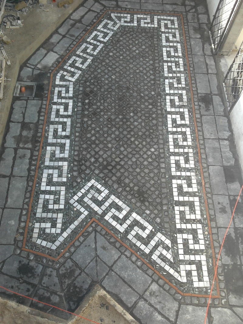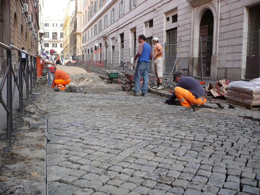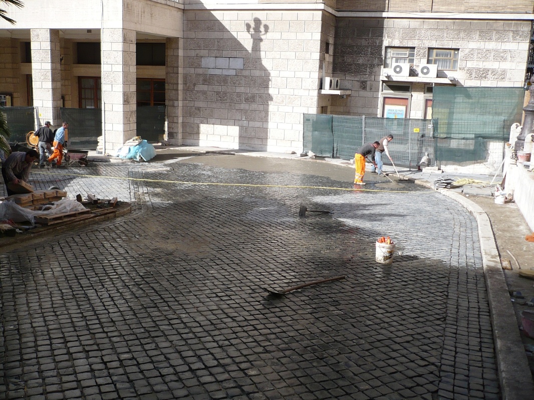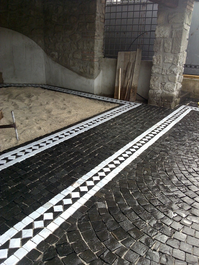 Pavimentazione in Selci Romani da recupero, su letto di sabbia e cemento, secondo le geometrie dell' arco contrastante, filare, spina o cerchi. Comprese tutte le forniture e la posa in opera.