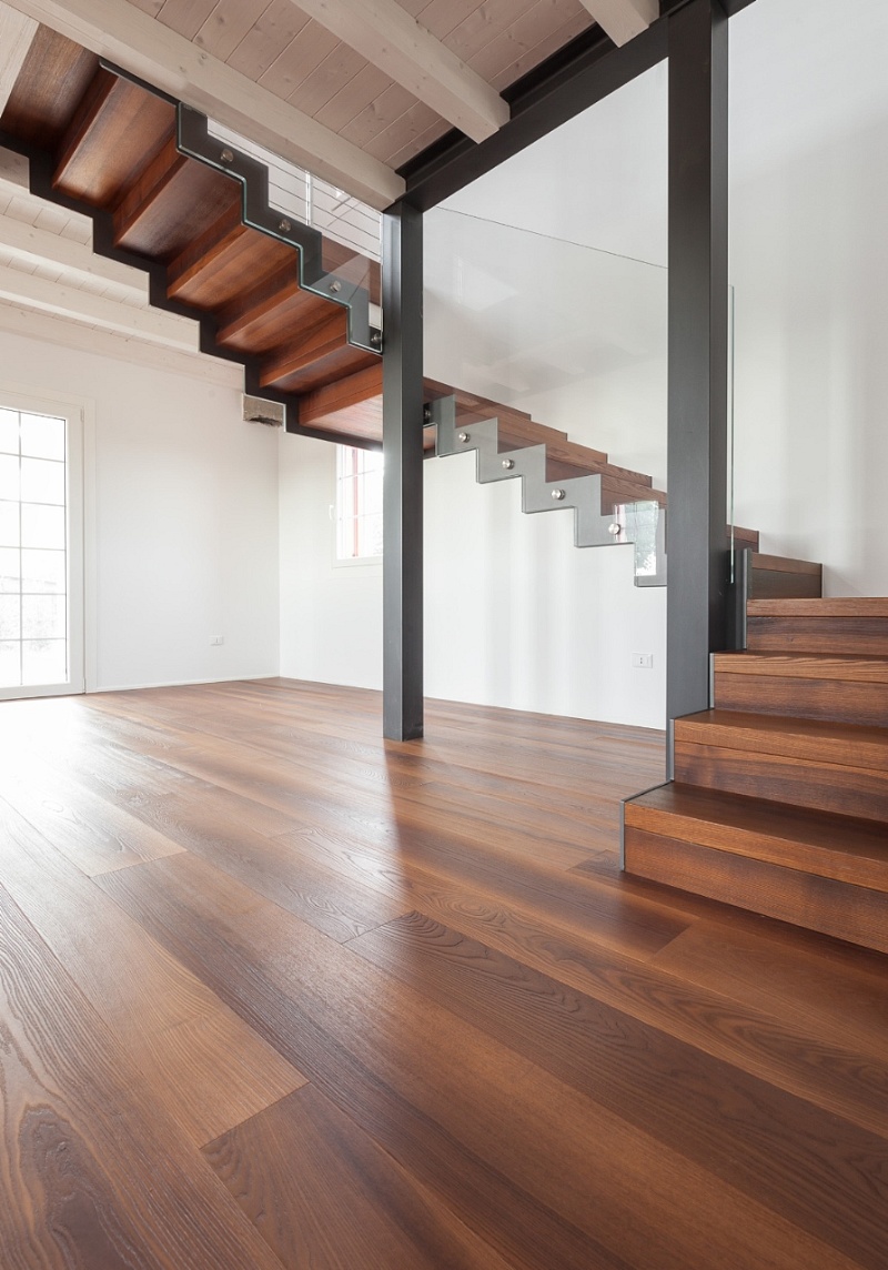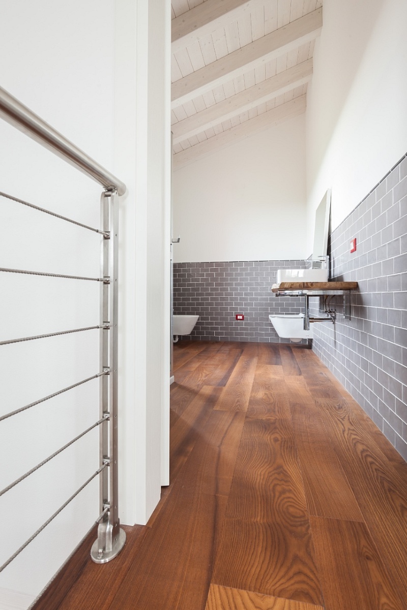 Realizzata in un ambiente fuori città, si è scelto di rivisitare i temi caratteristici delle abitazioni rurali in chiave moderna. Il pavimento caldo e contemporaneo si abbina con le finiture bianche dei locali, come le travi, gli arredi, le porte e le finestre; sapientemente azzardata un’originale scala autoportante con profili di acciaio e vetro.