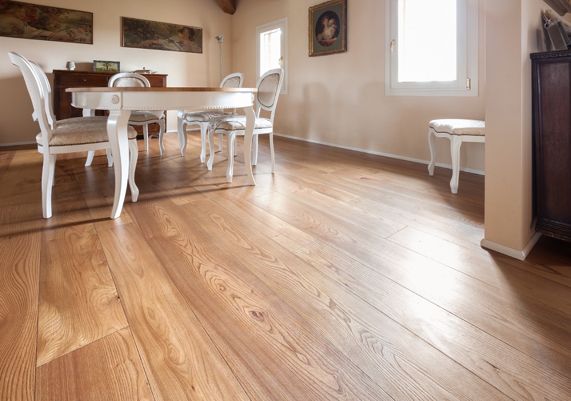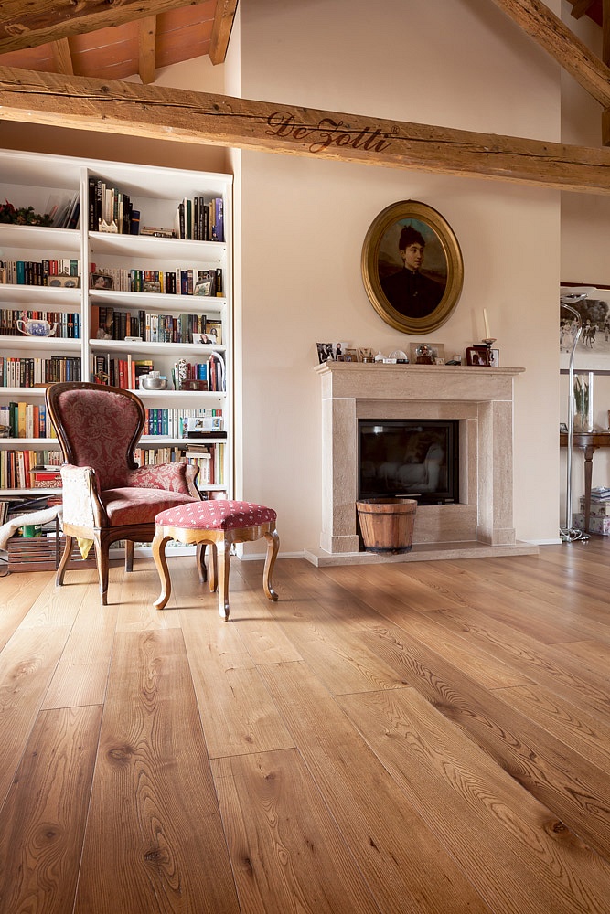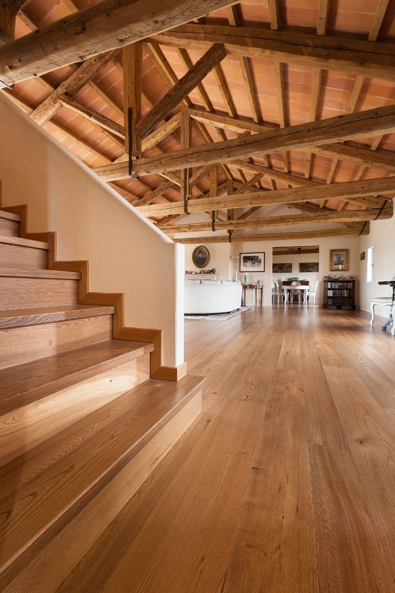 È stato scelto l’olmo per coniugare le tonalità calde delle travature con lo stile elegantemente classico degli arredi.