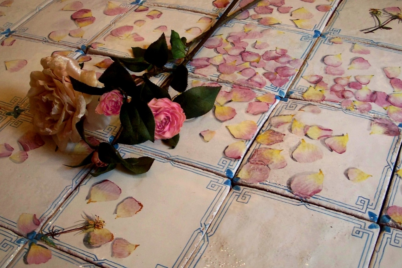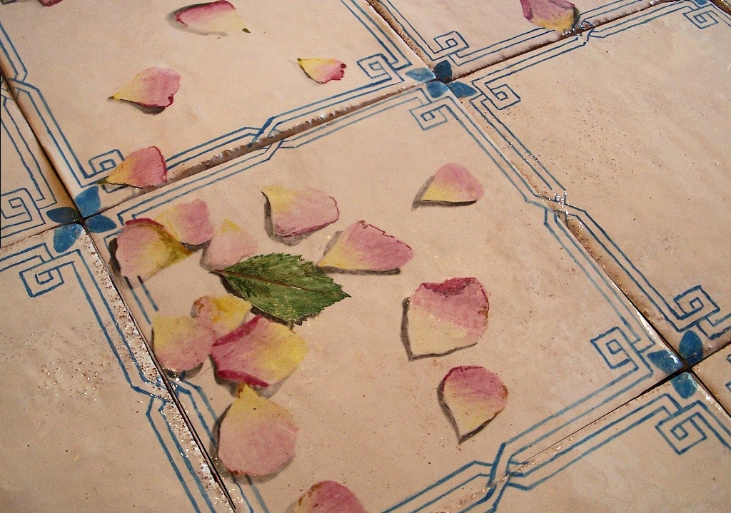 Pavimento in maiolica dipinta a mano realizzato riproducendo un antico pavimento scoperto di recente in una villa siciliana. L'originale è opera del Pittore Napoletano dell'800 Filippo Palizzi che regalò all'amante una stanza interamente pavimentata con petali di rosa che alcuni putti,affrescati sul soffitto, nei loro giochi lasciano cadere.