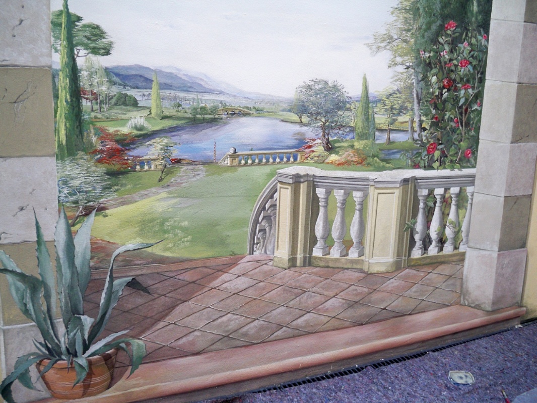 Dopo aver ascoltato l'esigenza della cliente, abbiamo, di comune accordo deciso di creare una illusione architettonica, sulla parete confinante di un cortile interno, che verosibilmente simulasse uno spazio aperto con veduta su un paesaggio con fiume e varie piante e fiori molto amati dalla committente appassionata di botanica.