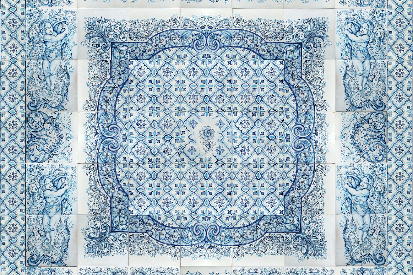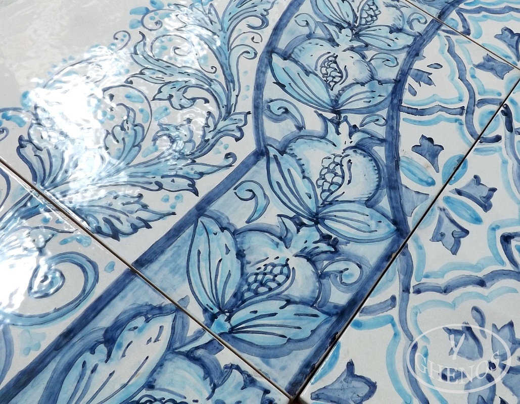 Pannello in maiolica dipinto mano,composto da 49 mattonelle cm30x30, 28 mattonelle cm 15x30 e 4 mattonelle cm 15x15. Composizione ispirata alle maioliche spagnole del XVII sec.