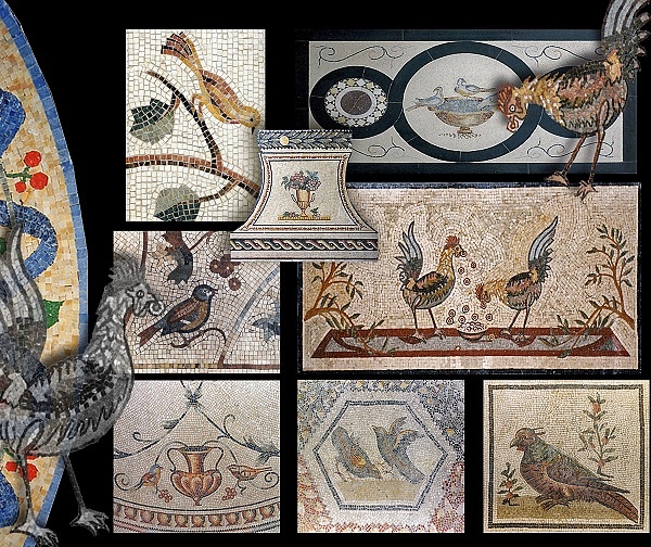 Mosaici in marmo. Mosaici da rivestimento o pavimento avente come soggetto gli uccelli, animali simbolici usati molto in pavimentazioni antiche.