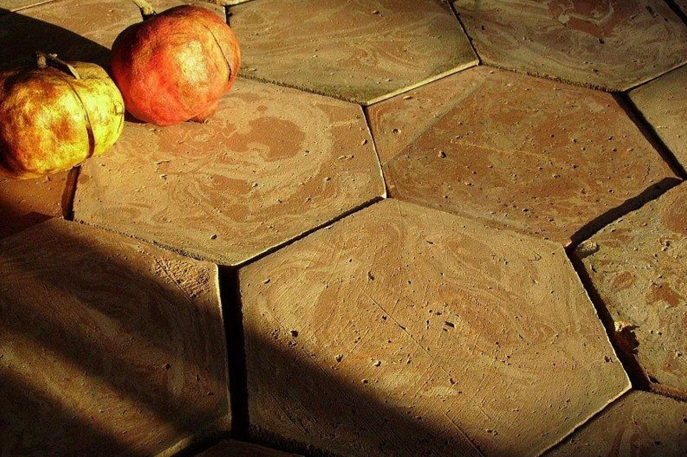 Pavimenti in cotto lombardo fatto a mano. Il cotto lombardo conosciuto anche con il nome di cotto medone è realizzato utilizzando due tonalità di argille con impasto detto a lasagna che permette di ottenere pianelle da pavimento con ben definite le aree con tonalità chiare e scure. Molto indicato a pavimentare case in area settentrionale ed in particolare quella lombarda. Disponibile in vari formati come il rettangolare,quadrato e, come nella foto, l'elegante esagonale