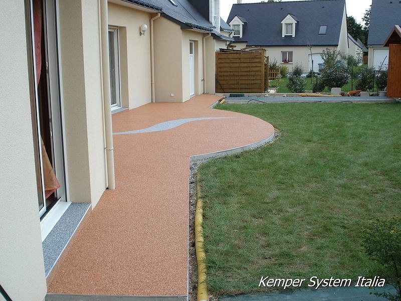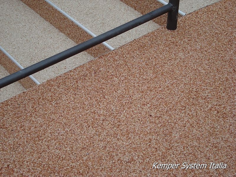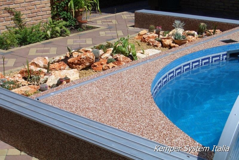 DEKOSTONE prevede l'impiego di ciottoli di marmo e resina poliuretanica alifatica la cui miscela consente di realizzare una superficie monolitica, antiscivolo e drenante.